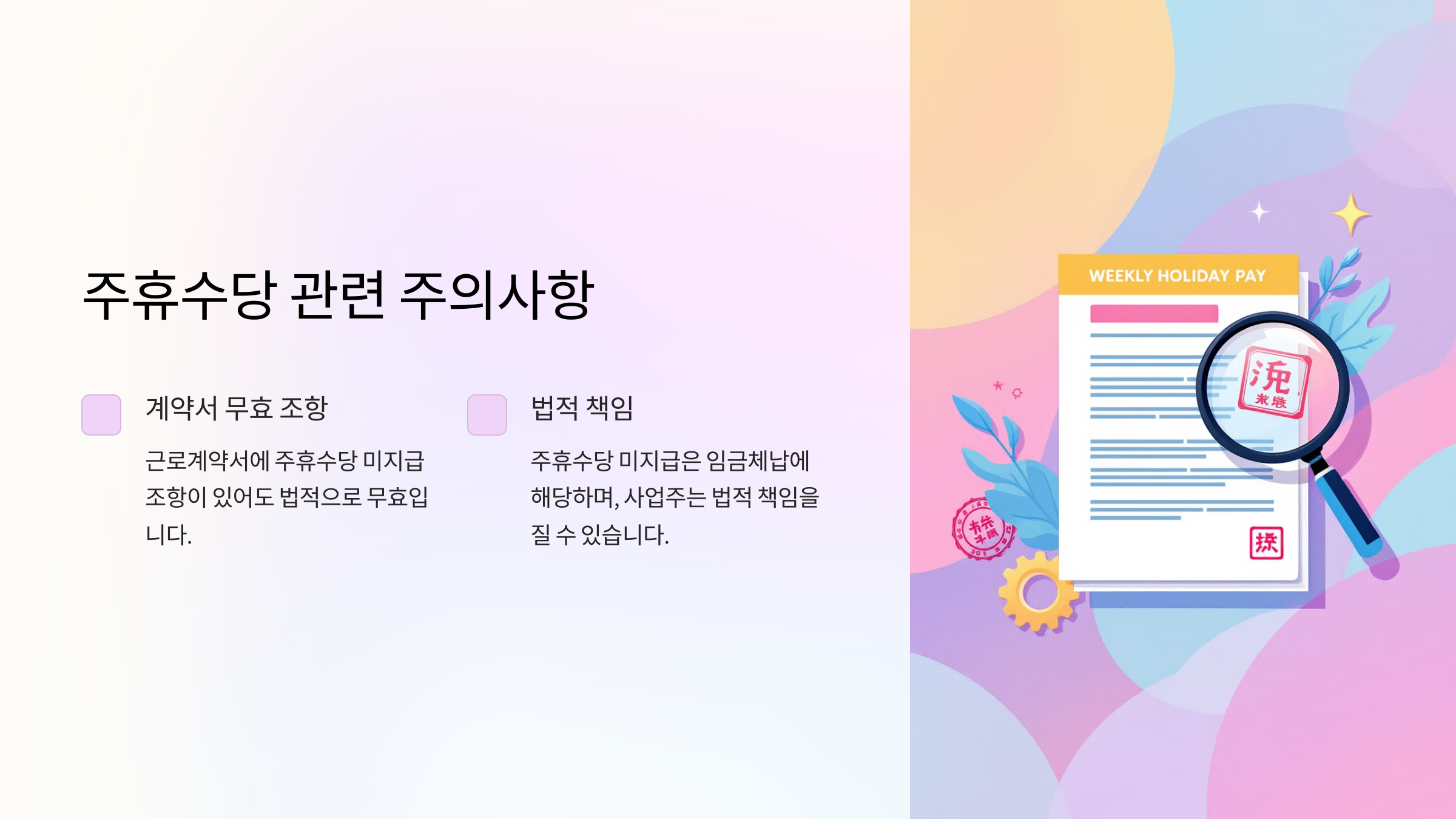 • 주휴수당 미지급은 임금체납에 해당하며, 사업주는 법적 책임을 질 수 있어요.