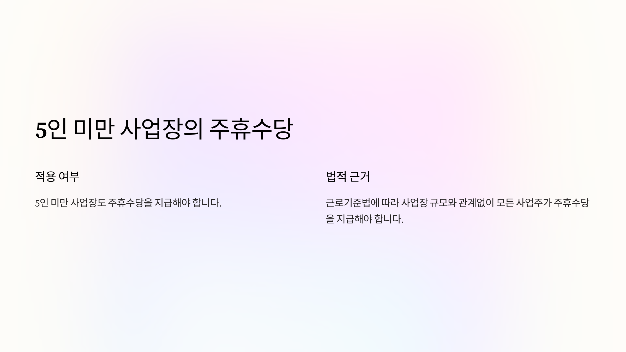 혹시 5인 미만 사업장에서 일하시는 분들도 계신가요? 저도 이 부분이 궁금해서 알아봤는데,  근로기준법에 따르면 사업장 규모와 관계없이 모든 사업주가 주휴수당을 지급해야 한다고 해요.