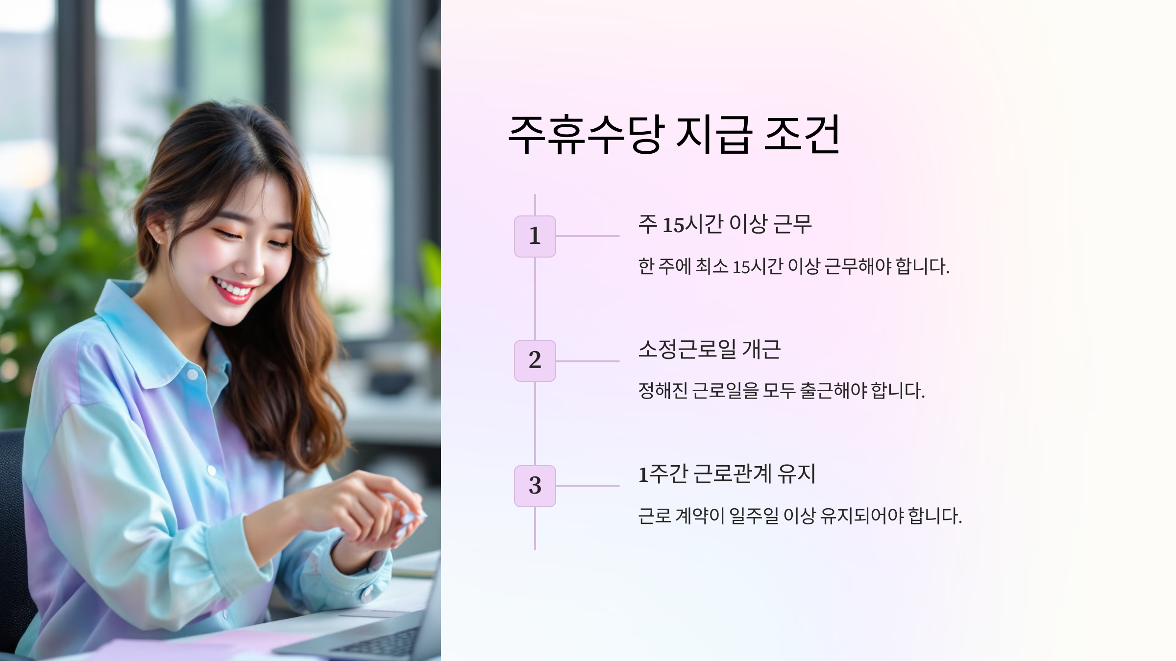 • 법적 요건 충족: 주 15시간 이상 근무하고 소정근로일을 개근한 근로자라면 고용 형태와 관계없이 주휴수당을 받을 수 있어요.