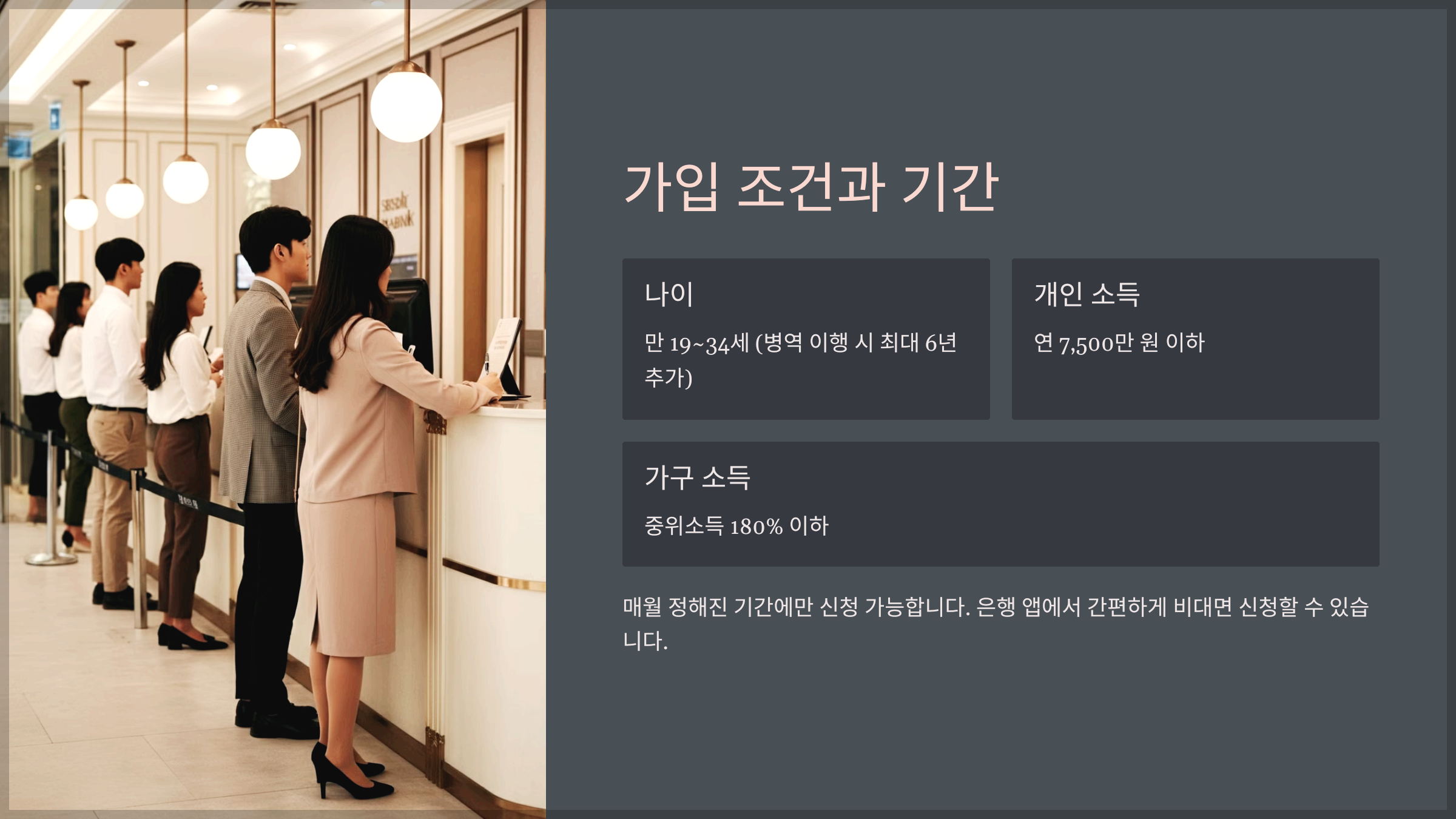 제가 가입했던 시점에는 매달 정해진 가입 신청 기간에만 신청할 수 있었습니다. 예를 들어, 12월 가입 신청은 12월 2일부터 18일까지였어요. 가입 조건은 아래와 같이 간단합니다.