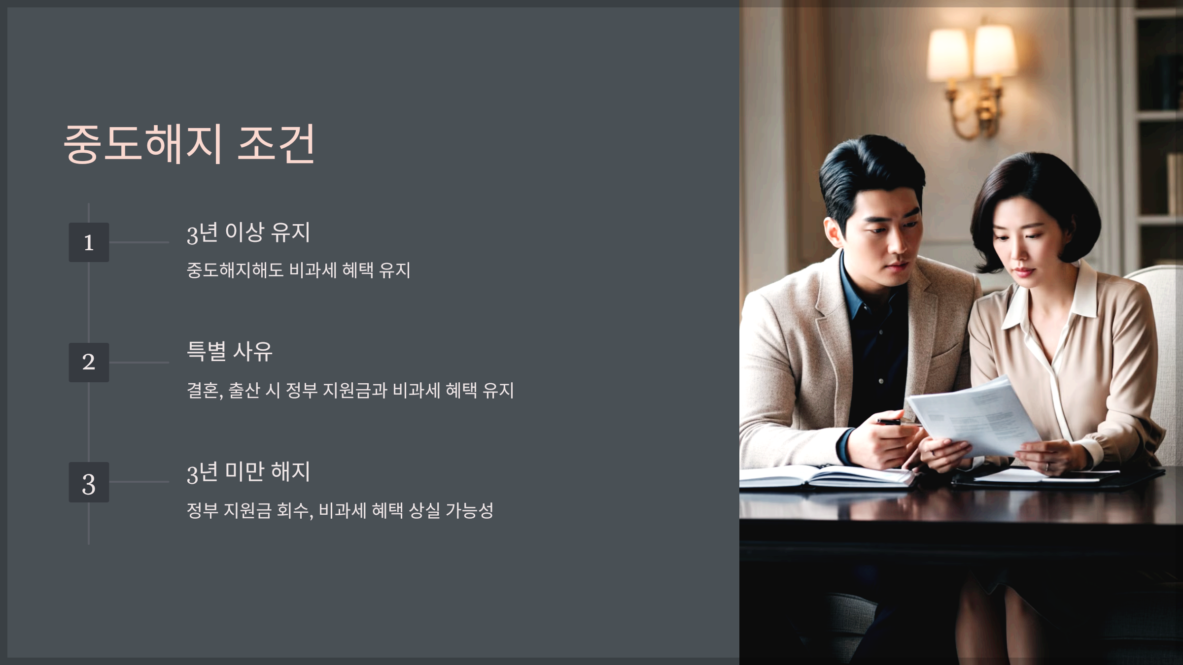 5년은 결코 짧은 시간이 아니기 때문에 중도해지가 고민될 수밖에 없었어요. 하지만 2024년부터는 3년 이상 유지 시 중도해지해도 비과세 혜택을 받을 수 있다는 점을 알고 마음이 놓였습니다. 또한 결혼, 출산 같은 특별 사유가 있을 경우에는 정부 지원금과 비과세 혜택을 그대로 받을 수 있었어요.