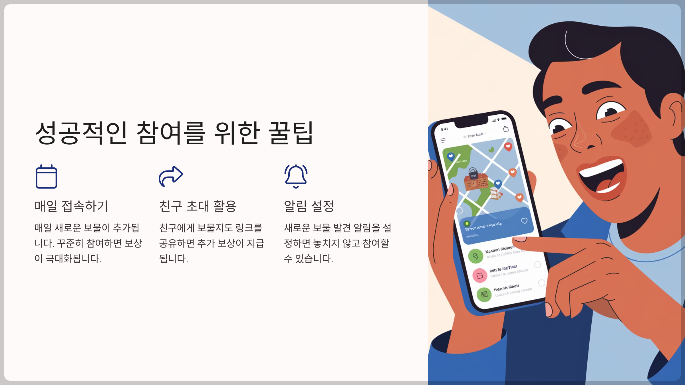 | 친구 초대 활용 | 친구에게 보물지도 링크를 공유하면 추가 보상이 지급됩니다. |