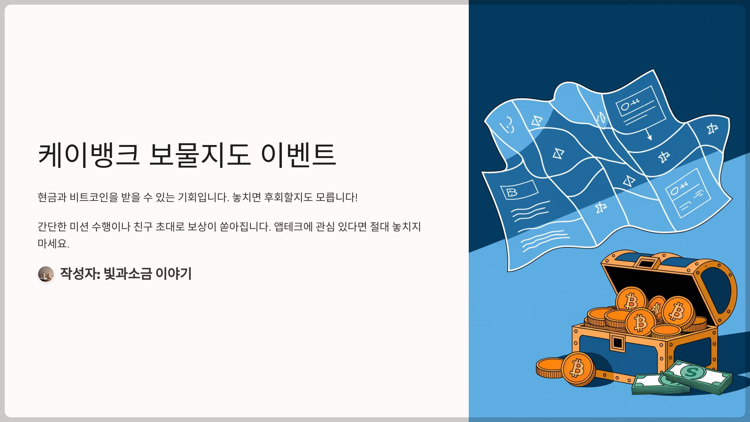 케이뱅크 보물지도 찾기 이벤트 완벽 가이드, 현금과 비트코인 잡아라입니다. 최근 케이뱅크의 '보물지도 이벤트'가 큰 화제가 되고 있다. 간단한 미션을 수행하거나 친구에게 링크를 공유하면