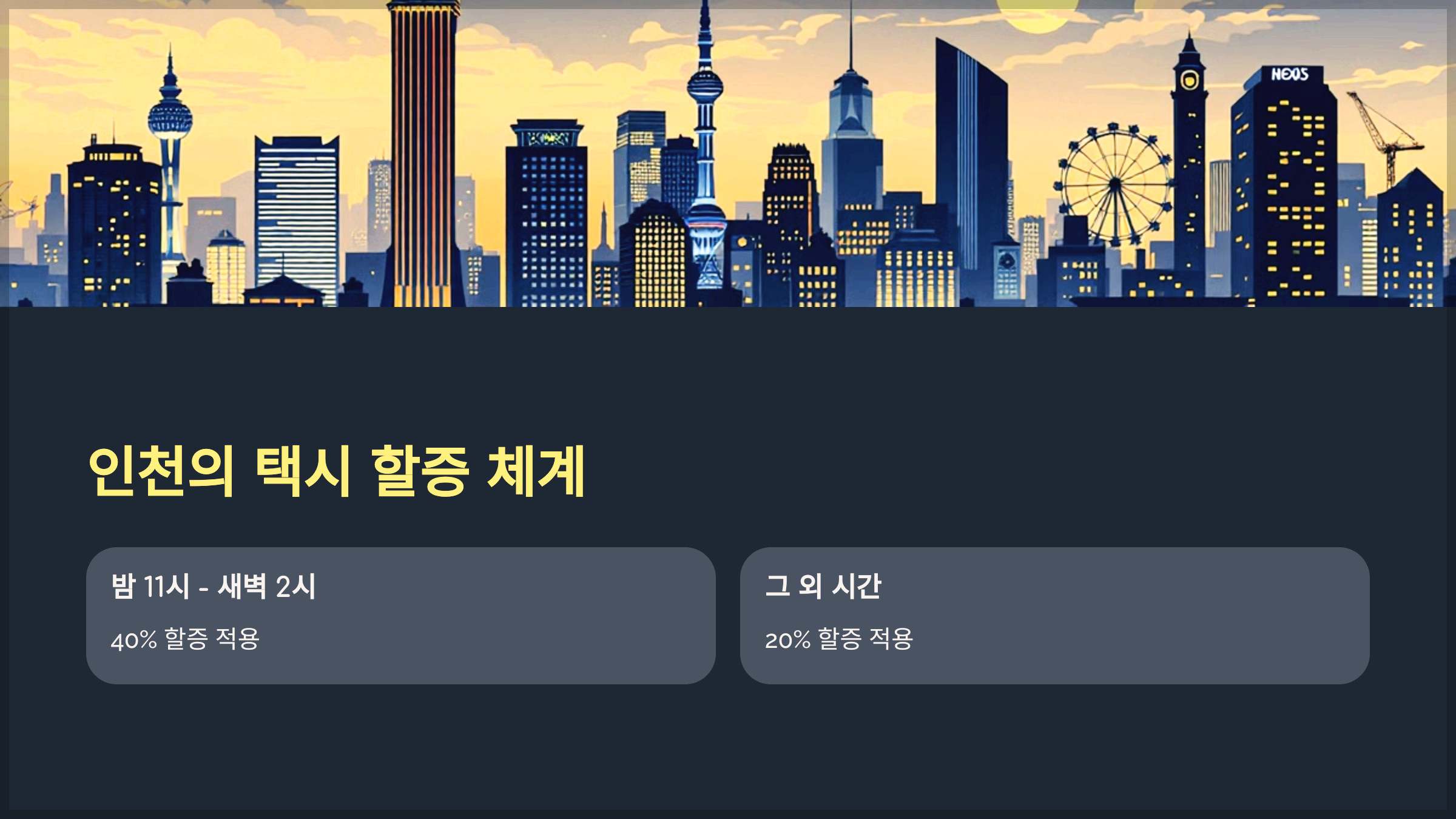 - 인천: 밤 11시 ~ 새벽 2시 40% 할증, 그 외 시간 20% 할증