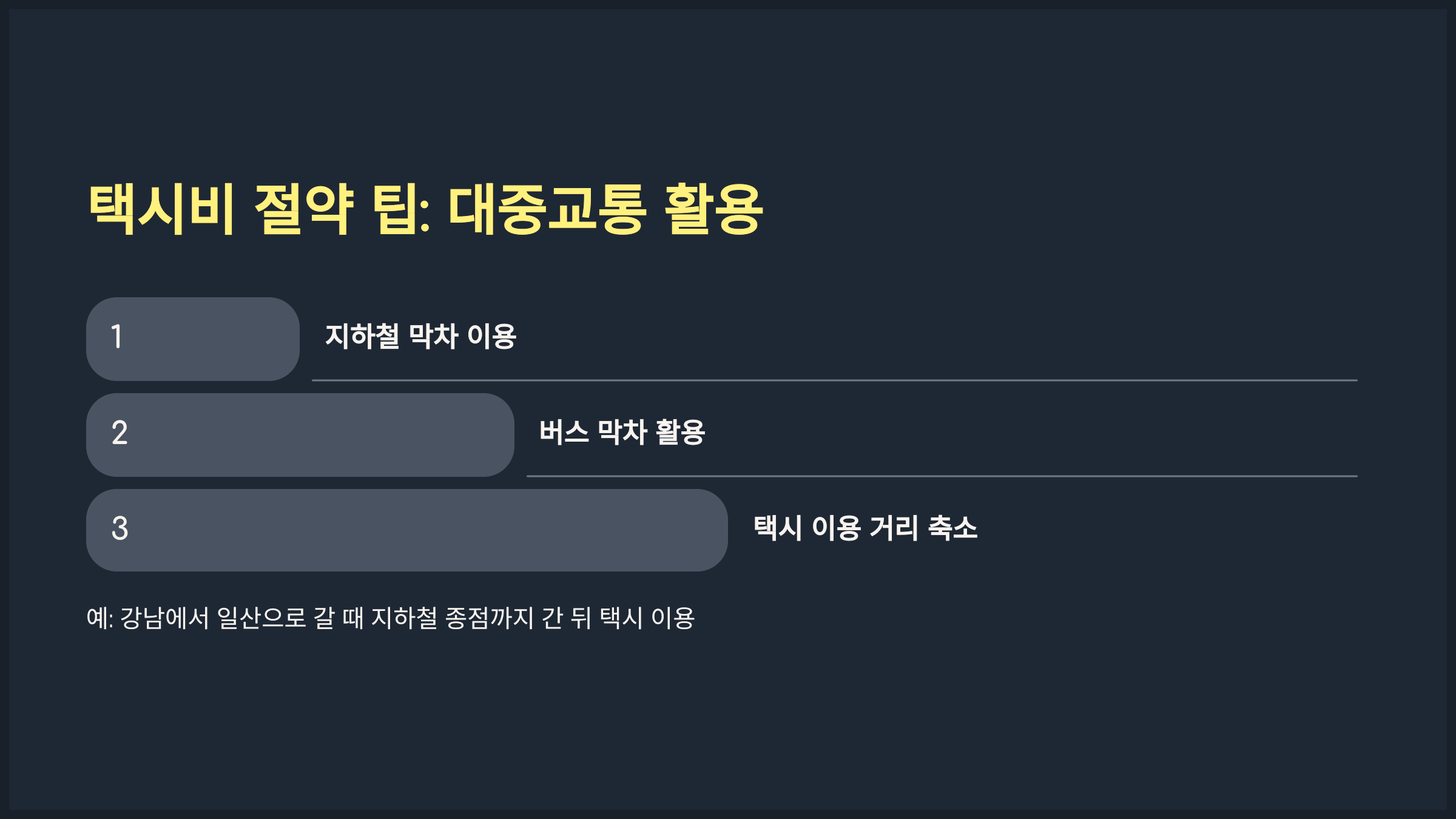 지하철이나 버스 막차를 활용해 택시 이용 거리를 줄이는 것도 좋은 방법입니다. 예를 들어, 강남에서 일산으로 이동할 때 지하철로 종점까지 간 뒤 택시를 이용하면 훨씬 경제적입니다.