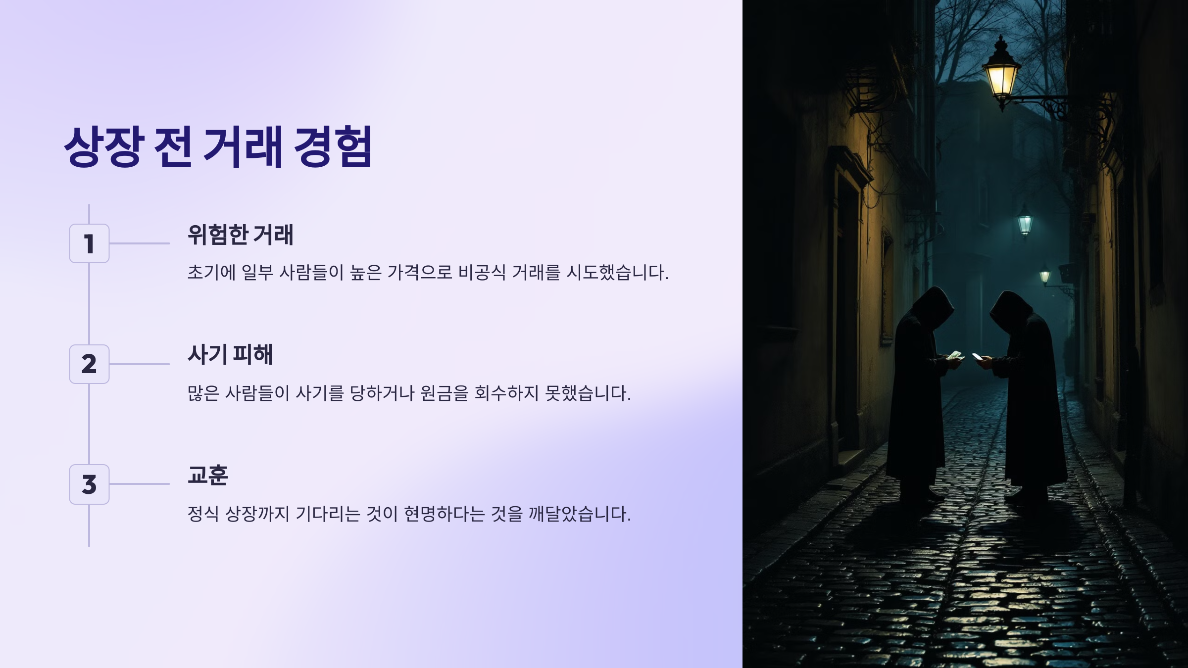 상장 전 거래는 매우 위험할 수 있습니다. 초기 단계에서 일부 사람들이 높은 가격으로 거래를 시도했지만, 결국 사기 피해를 보거나 원금을 회수하지 못한 사례가 많았습니다. 따라서 정식 상장이 이루어질 때까지 기다리는 것이 현명하다고 느꼈습니다.