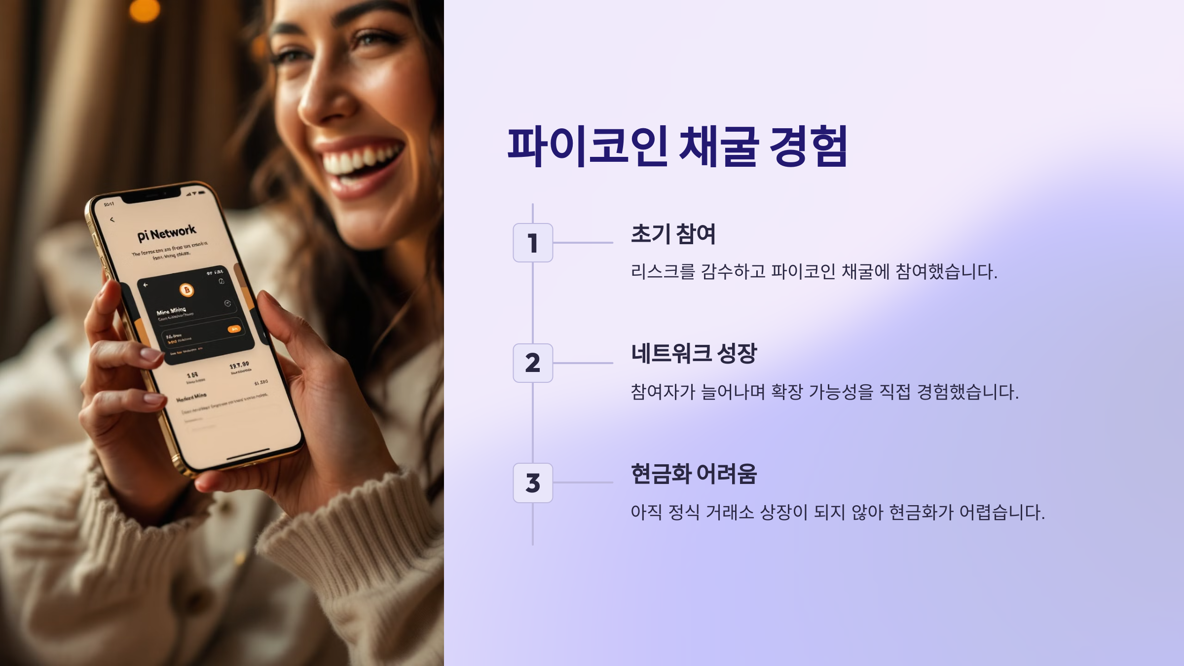 스마트폰으로 간편하게 채굴할 수 있다는 점이 매력적이었고, 당시 많은 사람이 암호화폐에 대한 신뢰하지 못했지만, 저 역시 어느 정도 리스크를 감수하고 참여하게 되었습니다. 네트워크가 성장하면서 저와 다른 많은 참여자가 그 확장 가능성을 직접 경험하게 되었죠. 그리고 현금화는 아직 정식 거래소에 상장이 되지 않아 현재는 어렵습니다. PiCoin은 생태계 구축과 사용자 인증(KYC) 과정을 점진적으로 진행 중입니다. 이 과정이 완룐 되면 암호화폐 거래소에 상장될 가능성이 큽니다.