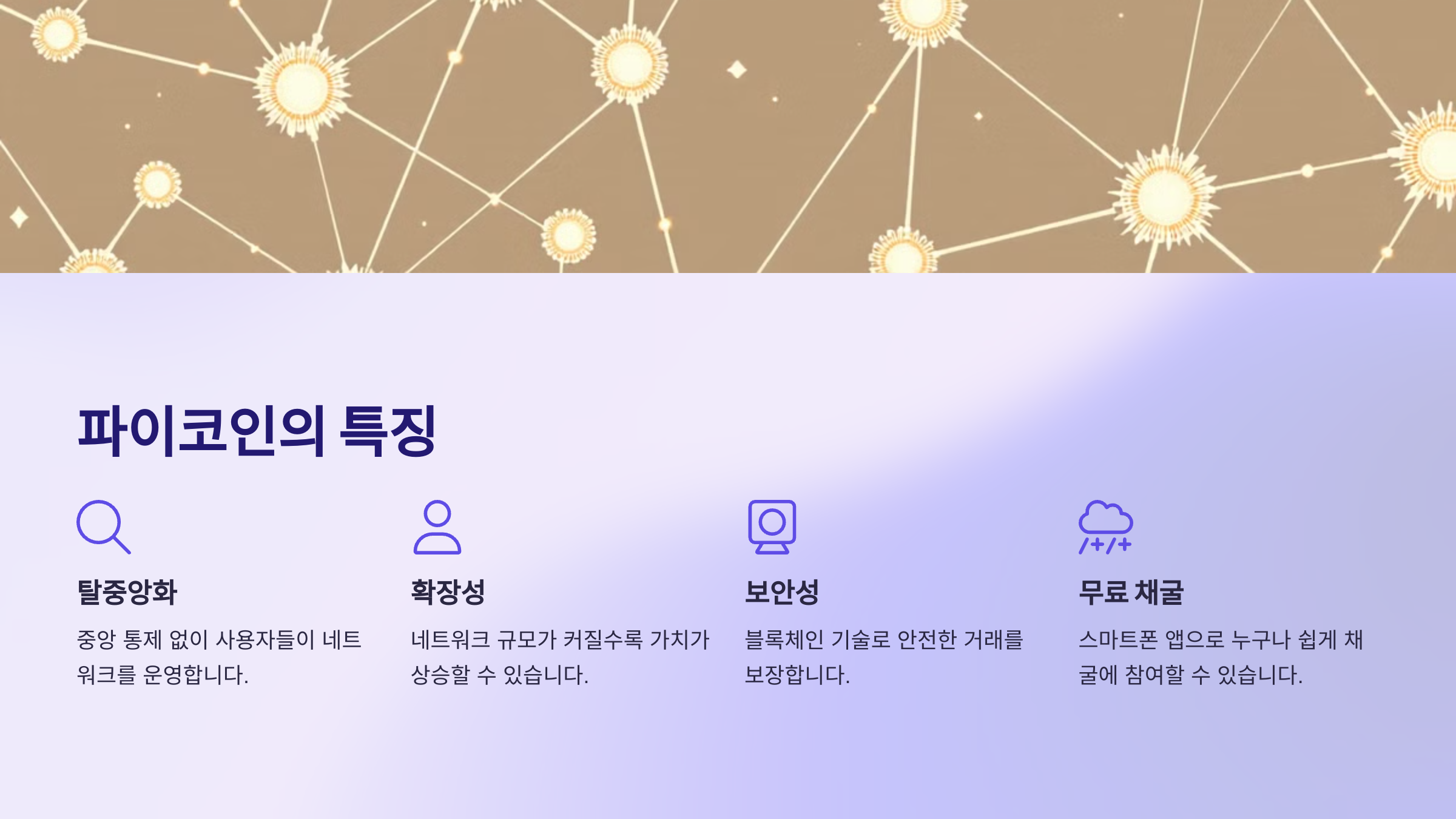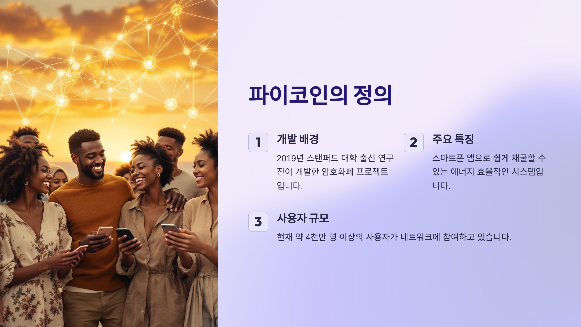 파이코인은 2019년에 스탠퍼드 대학 출신의 연구진이 개발한 암호화폐 프로젝트입니다. 가장 큰 특징은 스마트폰 앱을 통해 쉽게 채굴할 수 있다는 점이에요. 기존의 암호화폐들은 고성능 컴퓨터와 많은 전력을 필요로 하지만, 파이코인은 누구나 쉽게 참여할 수 있도록 에너지 효율적인 방식으로 설계되었습니다. 현재까지 약 4천만 명 이상의 사용자가 네트워크에 참여하고 있다는 점은 파이코인의 접근성이 얼마나 뛰어난지를 잘 보여줍니다. 파이코인은 탈중앙화, 확장성, 보안성, 무료 채굴, 그리고 대중성이라는 특징을 가지고 있으며, 전 세계적으로 많은 사람에게 주목받고 있는 디지털 화폐입니다. 앞으로 파이코인의 생태계가 더욱 발전할 것으로 기대되며, 이러한 특징들이 파이코인의 가치를 높이는 중요한 요소가 될 것입니다.