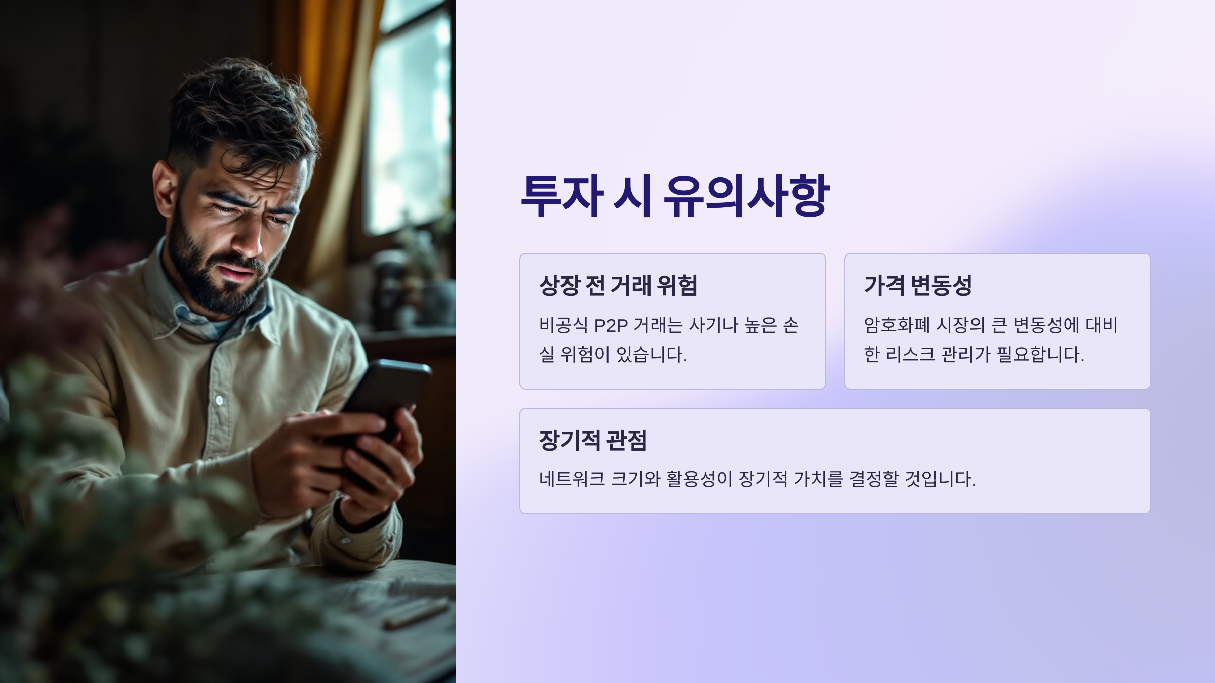 상장 전 거래의 위험성: 현재 파이코인은 정식으로 상장되지 않았기 때문에, P2P 형태로 이루어지는 비공식 거래는 사기나 높은 손실의 위험이 있습니다. 파이코인 개발팀도 메인넷 전환 전까지는 P2P 거래를 피할 것을 권고하고 있으므로, 안전한 거래를 위해 정식 상장 이후를 기다리는 것이 좋습니다.