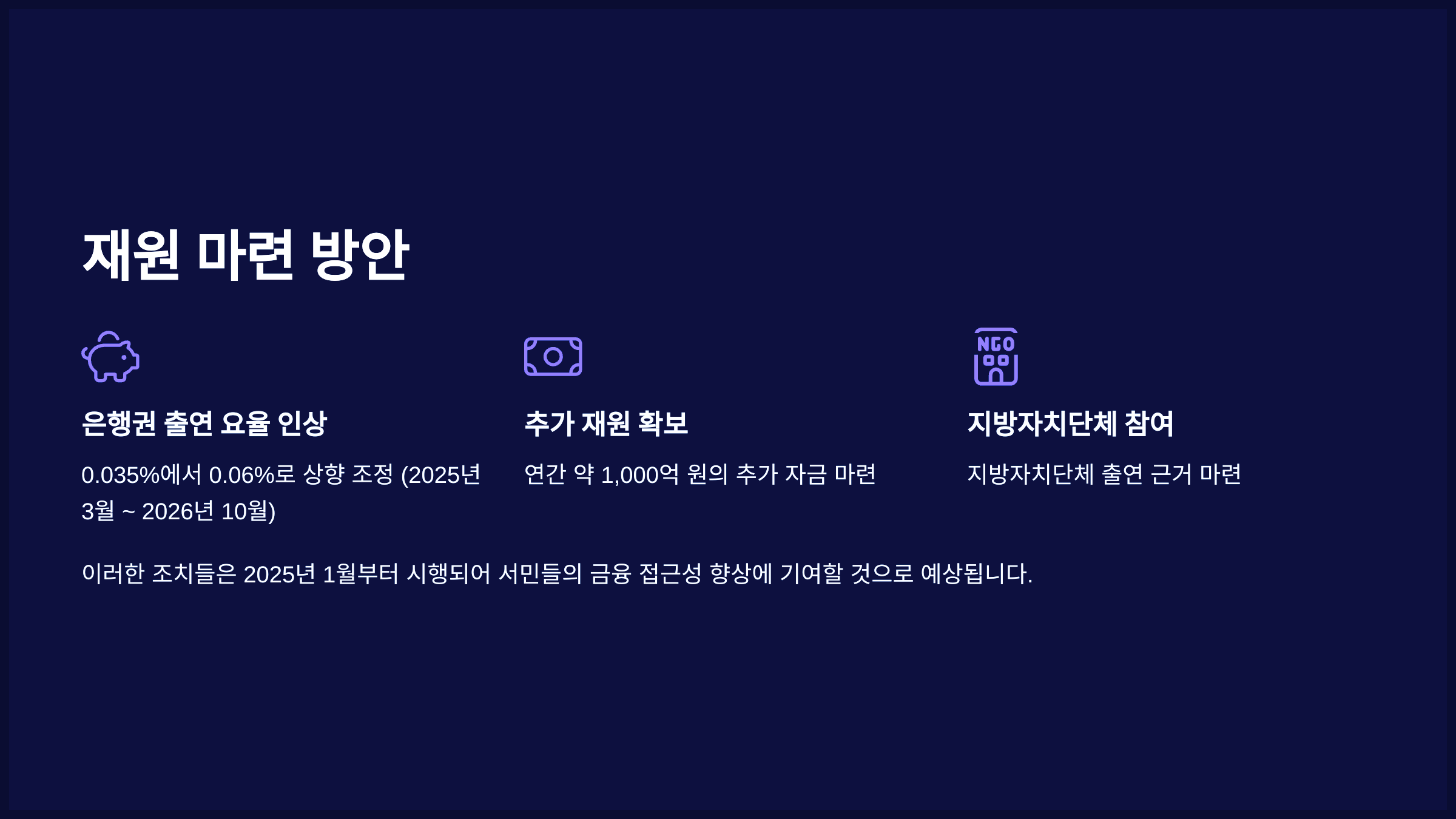 • 은행권 출연 요율을 0.035%에서 0.06%로 인상 (2025년 3월부터 2026년 10월까지 한시적 적용)