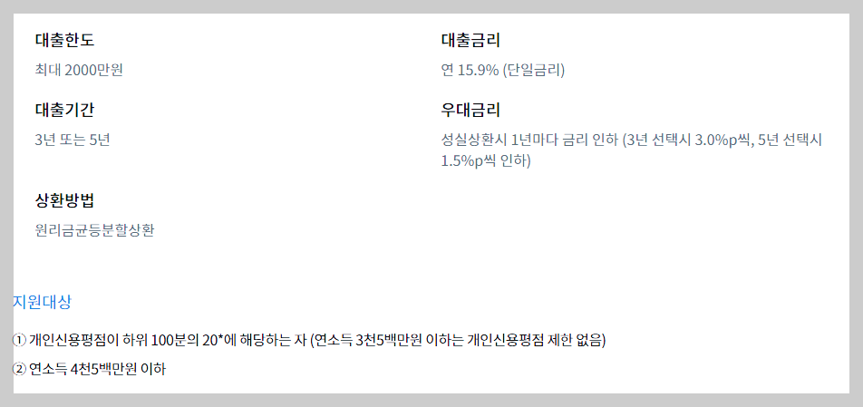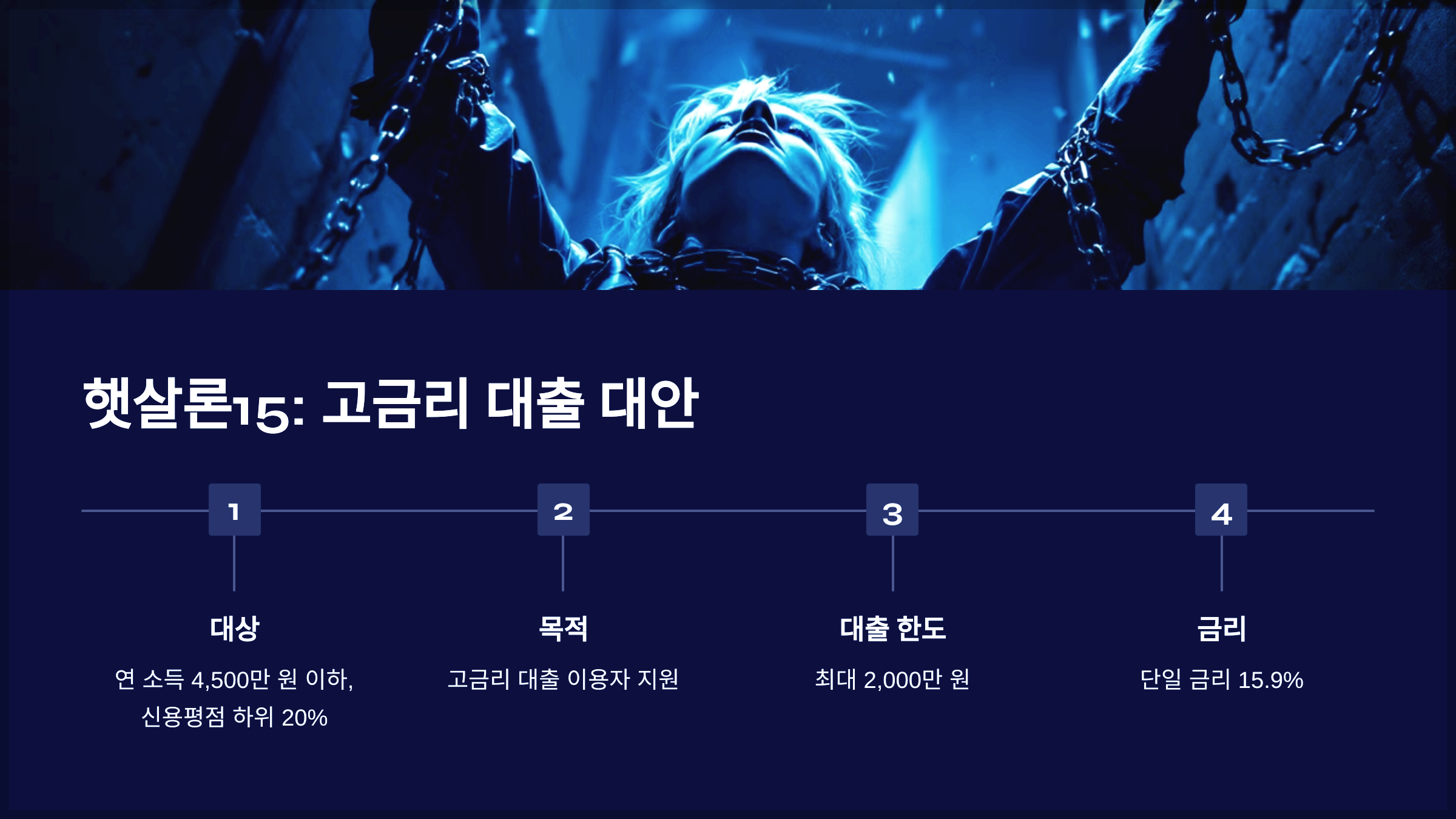 햇살론15는 기존 고금리 대출 이용자를 위한 상품으로, 연 소득 4,500만 원 이하이면서 신용평점 하위 20%에 해당하면 신청할 수 있습니다. 최대 2,000만 원까지 대출 가능하며, 단일 금리 15.9%로 운영됩니다.