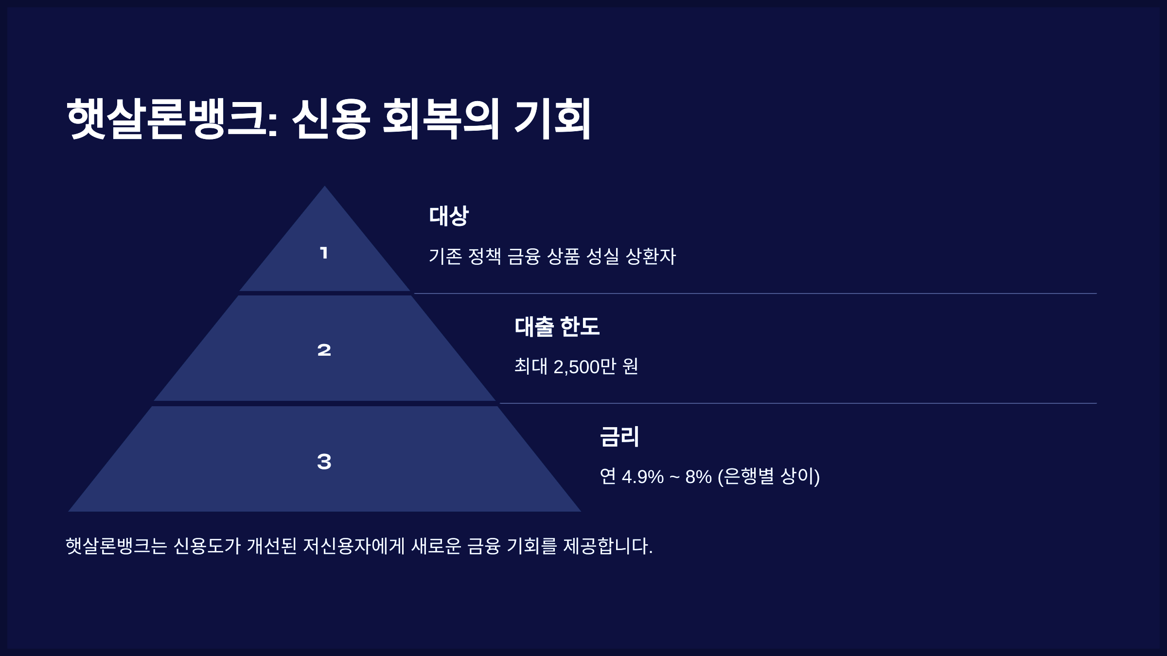 햇살론뱅크는 기존 정책 금융 상품을 성실히 상환한 고객을 대상으로 한 상품입니다. 부채를 성실히 상환하며 신용도가 개선된 저신용자에게 새로운 금융 기회를 제공합니다. 최대 2,500만 원까지 대출 가능하며, 금리는 은행별로 다르지만, 일반적으로 연 4.9% ~ 8% 수준입니다.