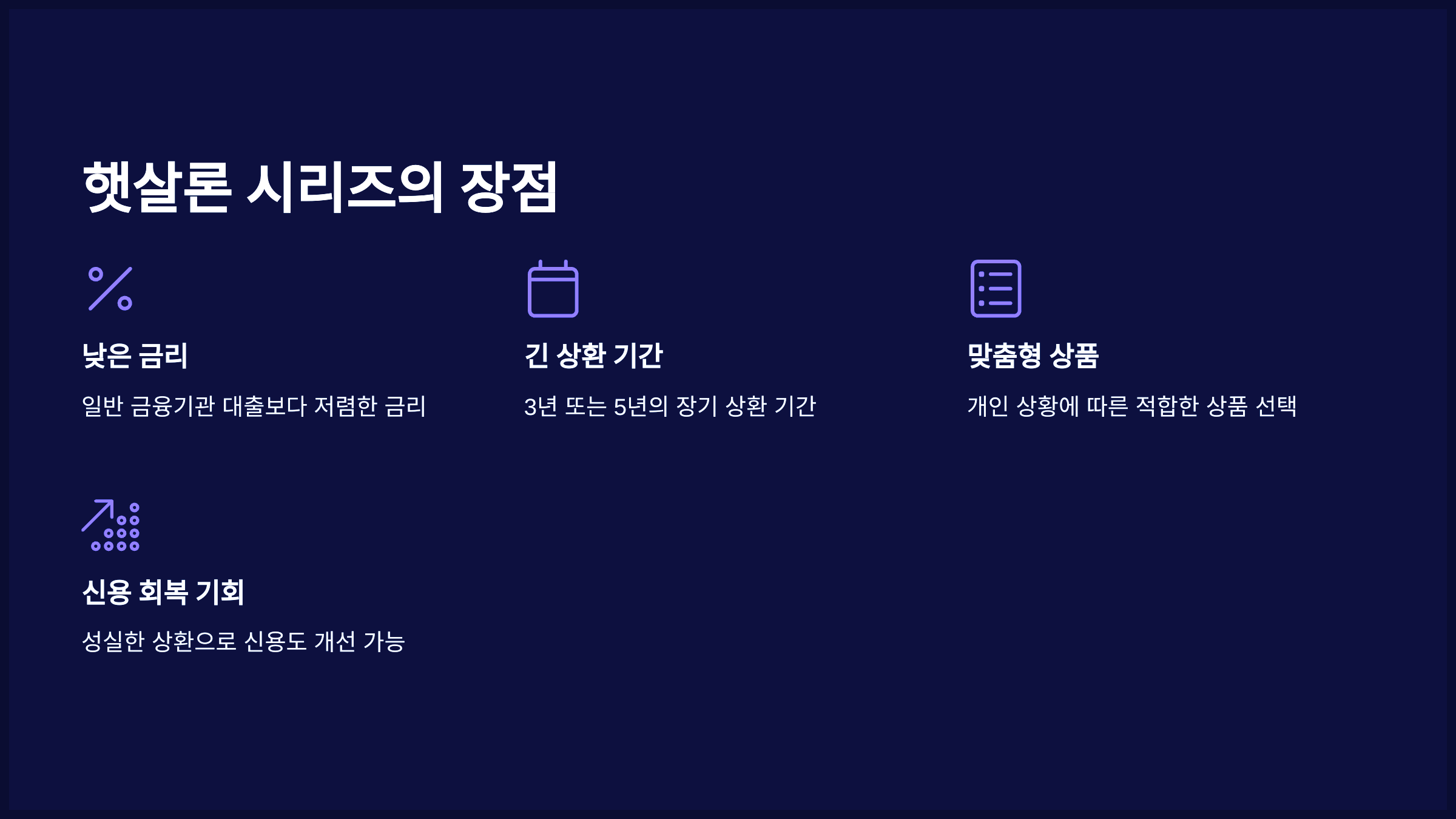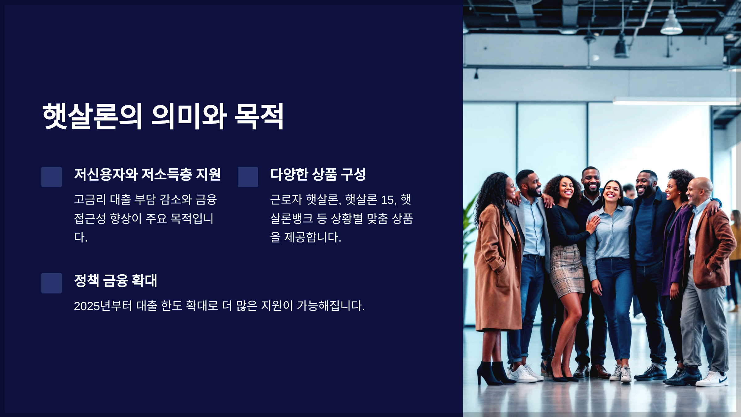 햇살론은 저신용자와 저소득층을 대상으로 한 정책 금융 상품입니다. 고금리 대출로 인한 부담을 줄이고 금융 접근성을 높이기 위해 마련되었습니다. 근로자 햇살론, 햇살론 15, 햇살론뱅크 등 다양한 상품이 있어 개인의 상황에 맞춰 선택할 수 있습니다.