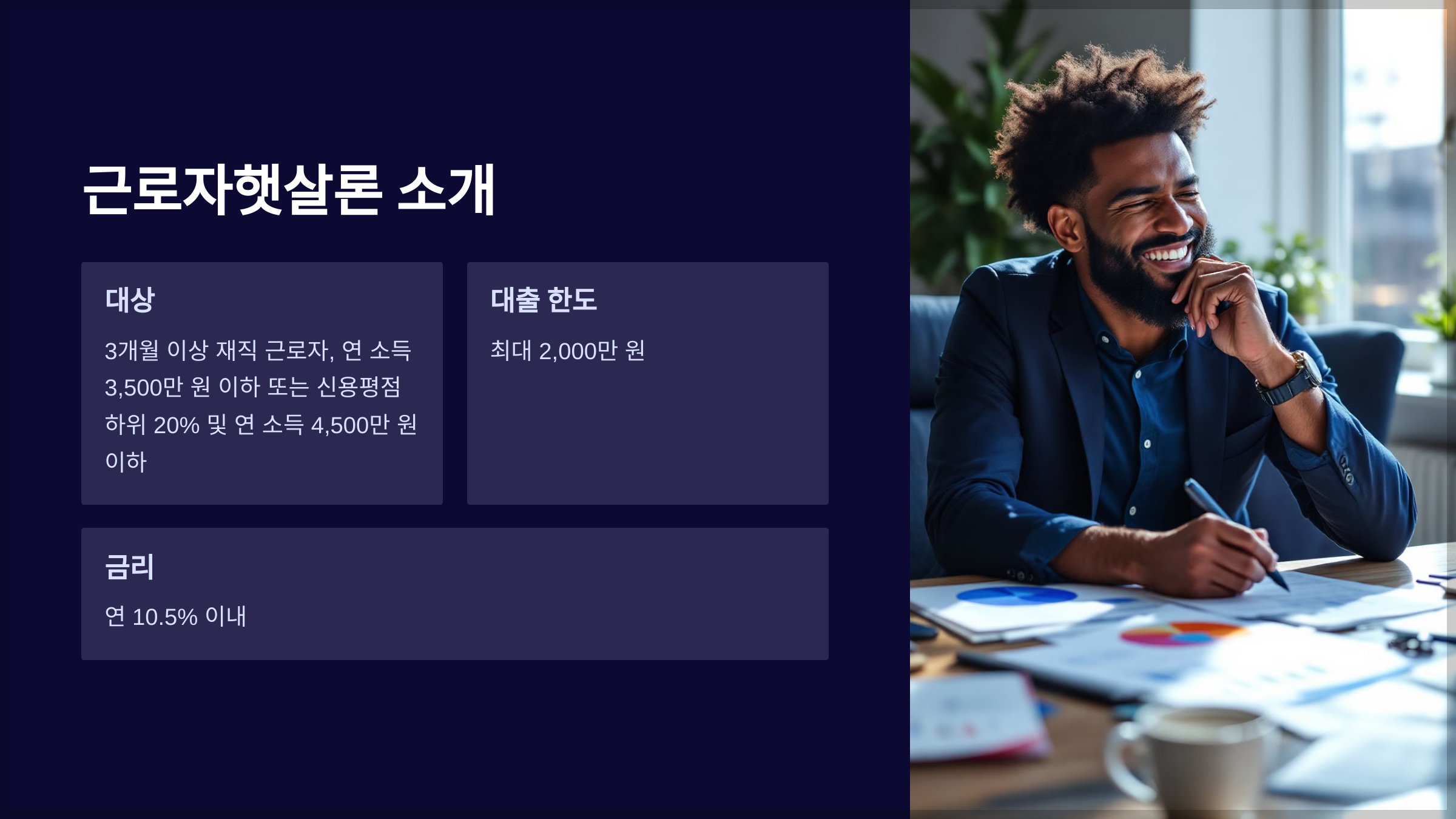 근로자햇살론은 3개월 이상 근무한 근로자를 대상으로 하며, 연 소득이 3,500만 원 이하이거나 신용평점 하위 20%이면서 연 소득이 4,500만 원 이하면 신청할 수 있습니다. 최대 2,000만 원까지 대출 가능하며, 금리는 연 10.5% 이내로 설정됩니다.