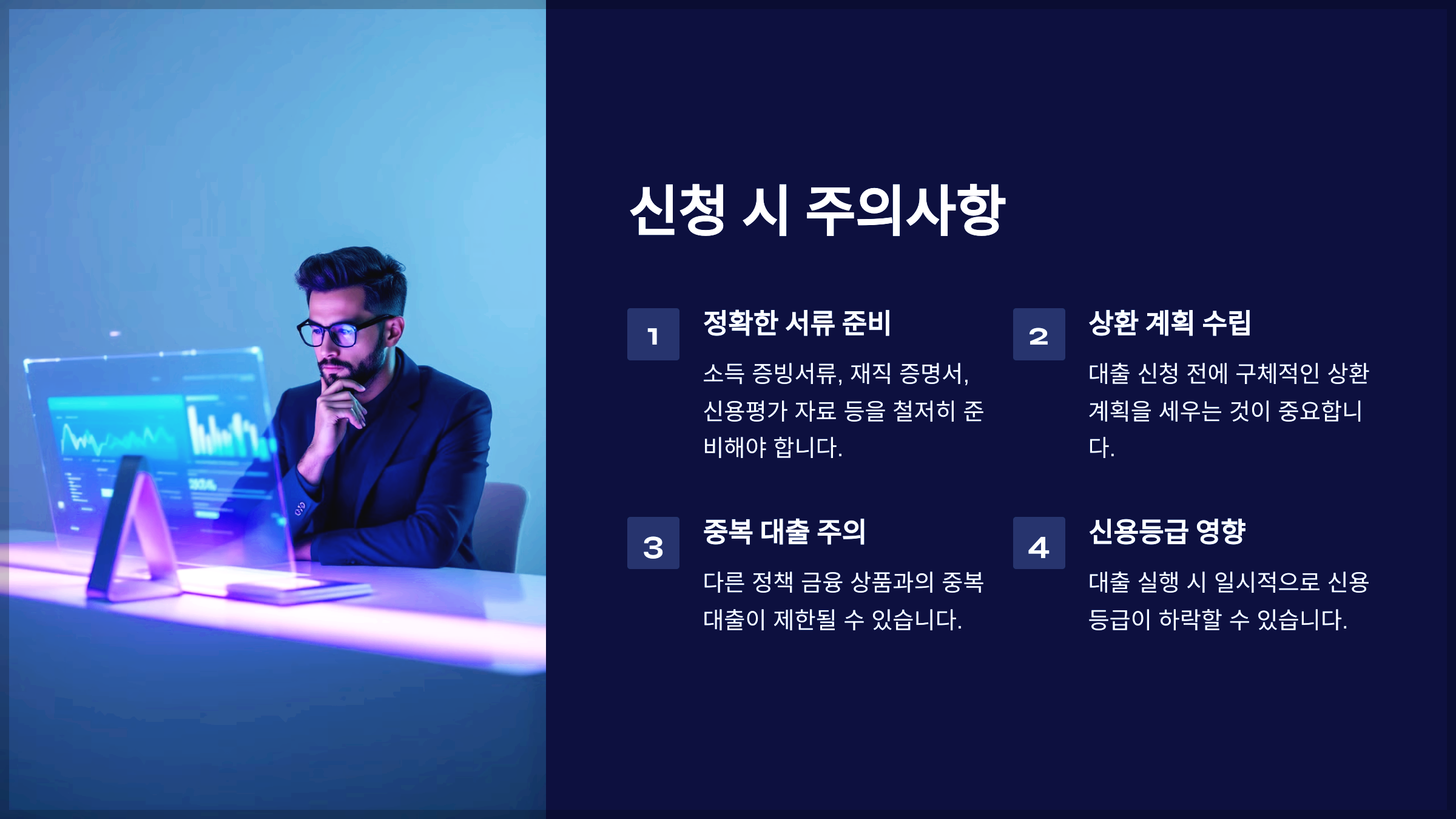 • 중복 대출 주의: 다른 정책 금융 상품과의 중복 대출이 제한될 수 있습니다.