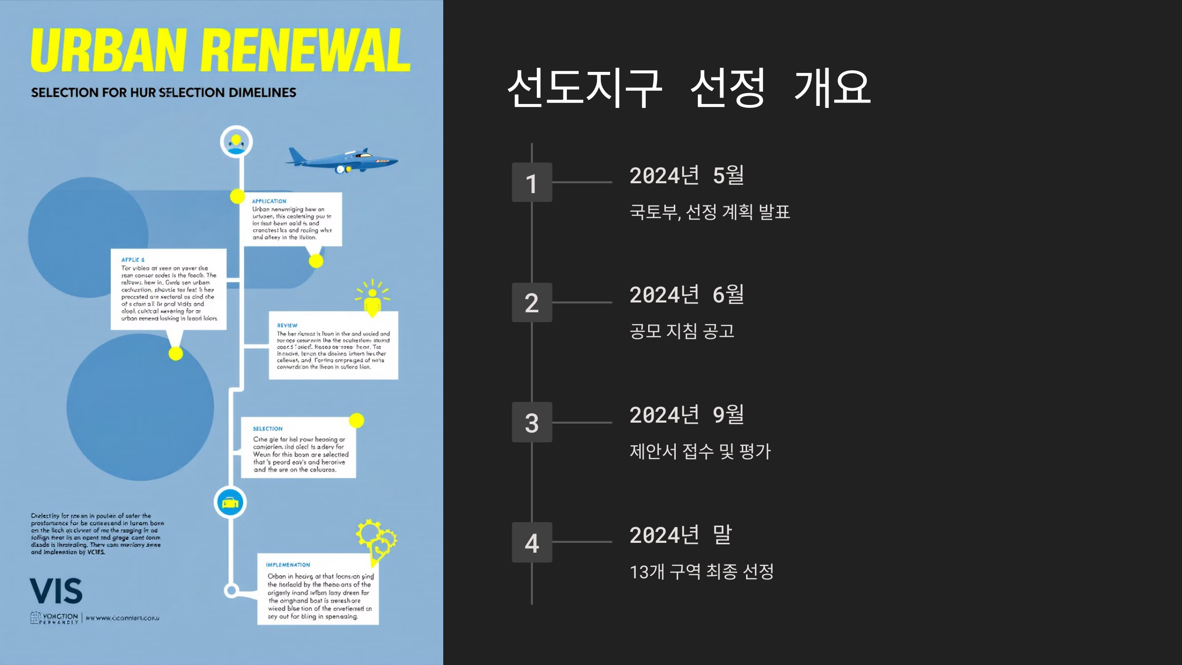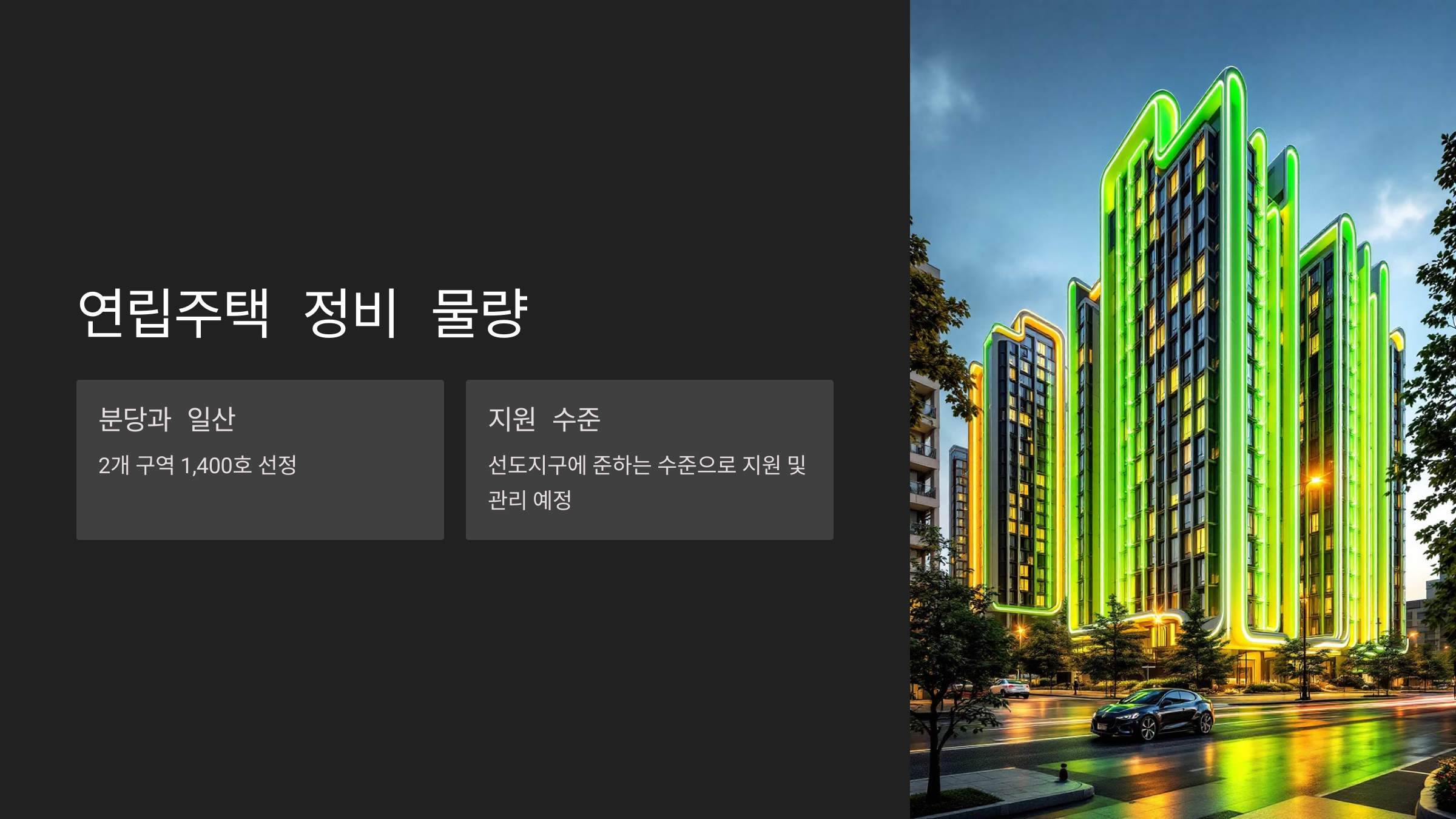 - 통합정비 가이드라인 배포: 주민들의 이해를 돕기 위해 통합정비와 공공기여금 관련 가이드라인을 제작하여, 12월 중 주민과 지자체에 배포합니다. 이를 통해 정비 절차를 쉽게 이해하고 참여할 수 있도록 돕습니다.