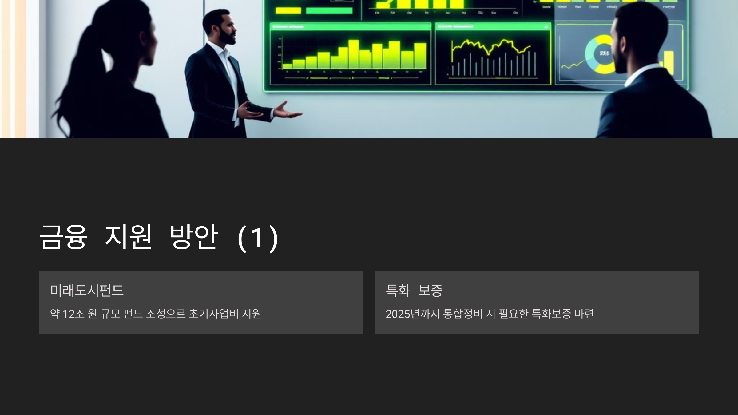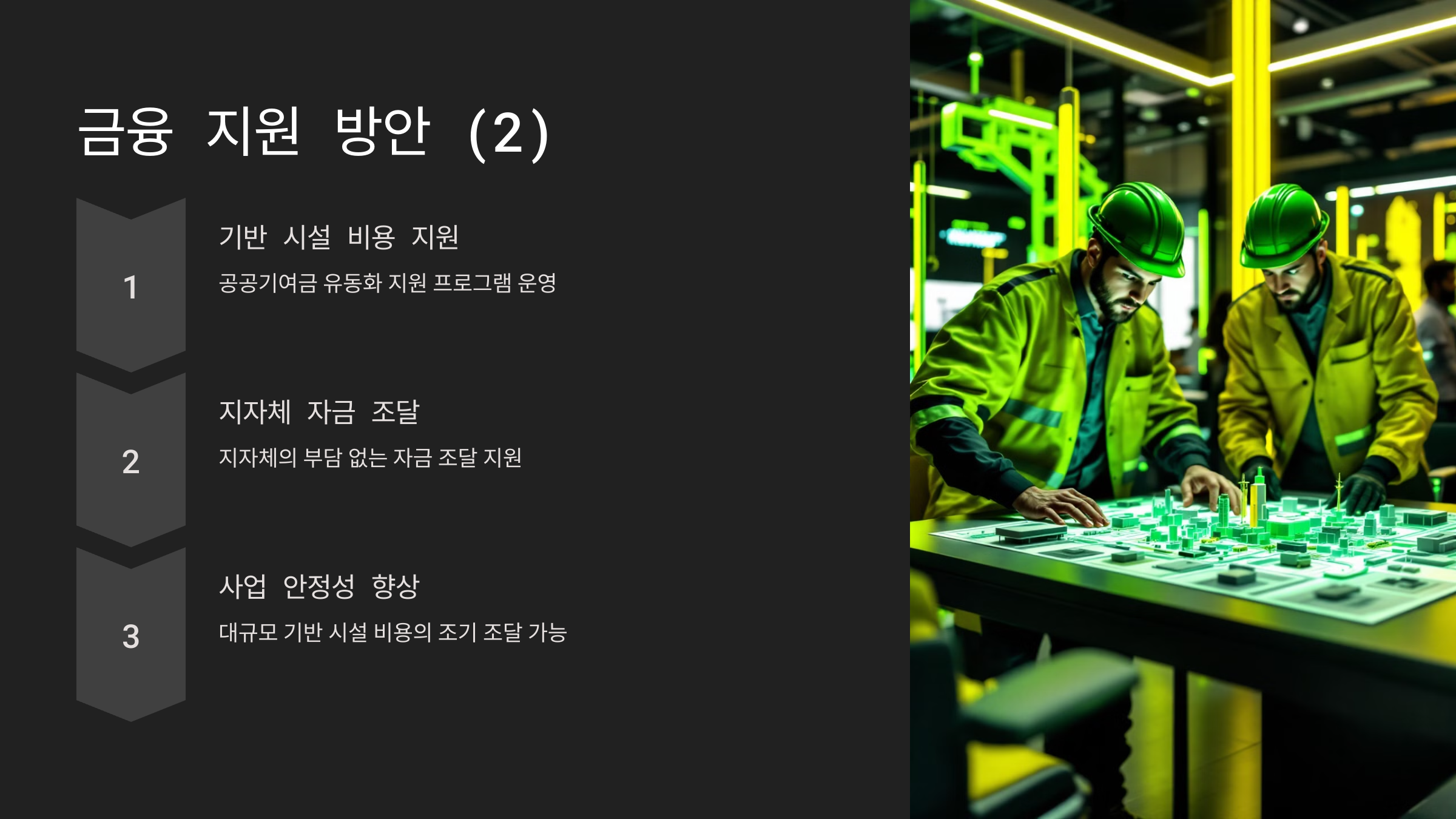 기반 시설 비용 지원: 대규모 기반 시설 비용을 조기 조달할 수 있도록 공공기여금 유동화 지원 프로그램을 운영합니다. 이를 통해 지자체가 부담 없이 자금을 조달할 수 있도록 도울 것입니다.