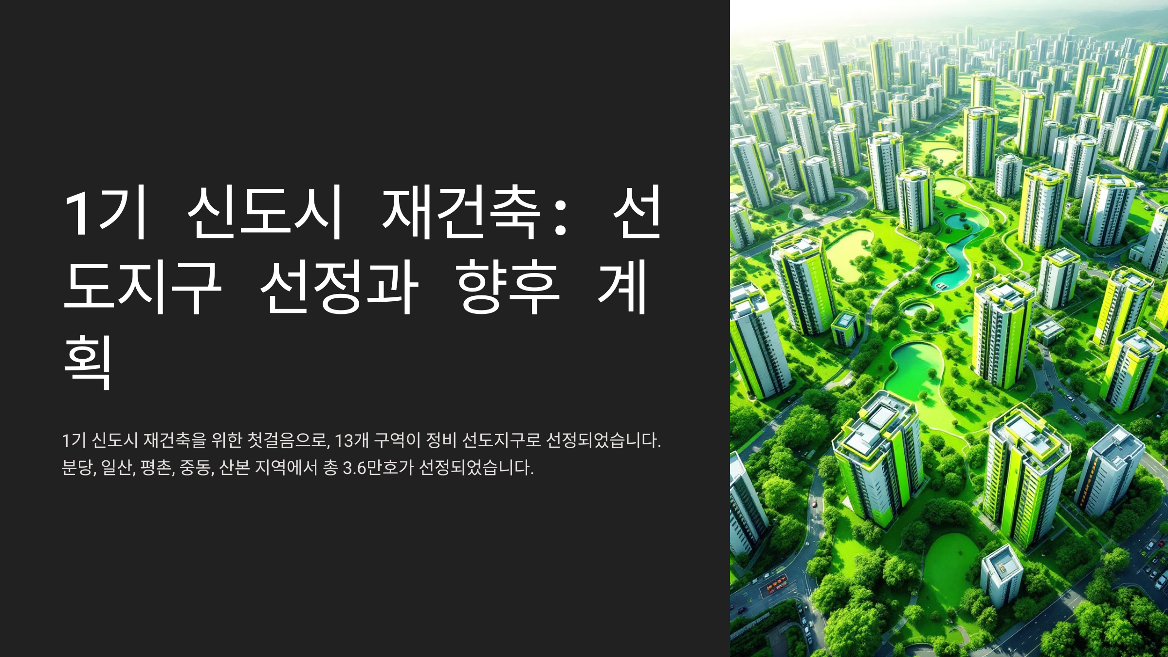 1기 신도시의 재건축은 주민들의 생활 환경을 개선하고 지역의 미래 가치를 높이는 중요한 과정입니다. 이번에 선정된 선도지구들은 이를 위한 첫걸음으로, 국토부와 지자체의 지원을 통해 보다 빠르고 원활하게 추진될 것입니다. 주민들의 협력과 이해를 통해 재건축이 성공적으로 이루어져, 모두가 더 나은 생활환경에서 살 수 있기를 기대합니다.