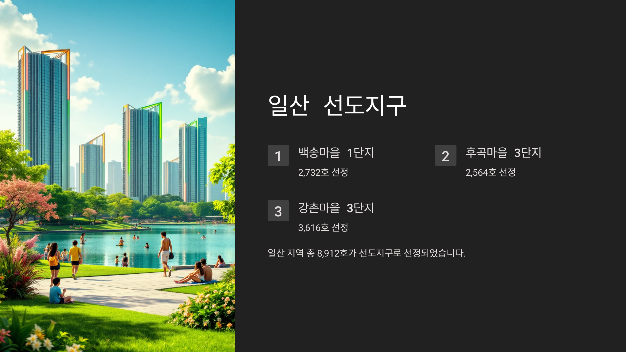 - 일산: 백송마을 1단지 (2,732호), 후곡마을 3단지 (2,564호), 강촌마을 3단지 (3,616호)로 총 8,912호가 선정되었습니다.