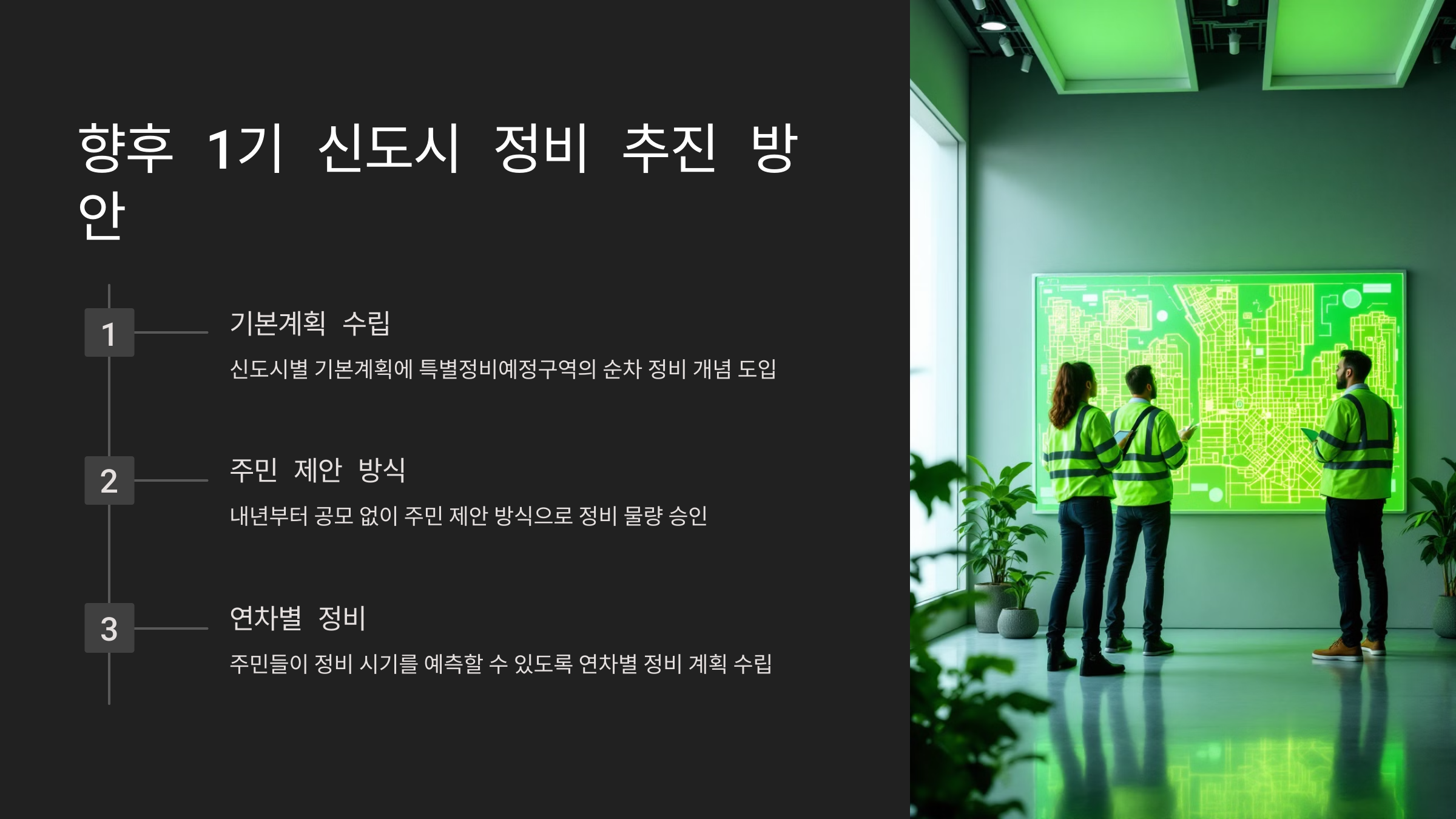 향후 국토부와 각 지자체는 신도시별 기본계획에 특별정비예정구역의 순차 정비 개념을 도입할 예정입니다. 내년부터는 공모 없이 주민 제안 방식을 통해 연차별 정비 물량 내에서 승인하는 방안을 검토하고 있습니다. 이는 주민들이 정비 시기를 예측할 수 있도록 하여, 올해 선도지구가 안 되면 정비가 어렵다는 불안감을 해소하기 위한 것입니다.