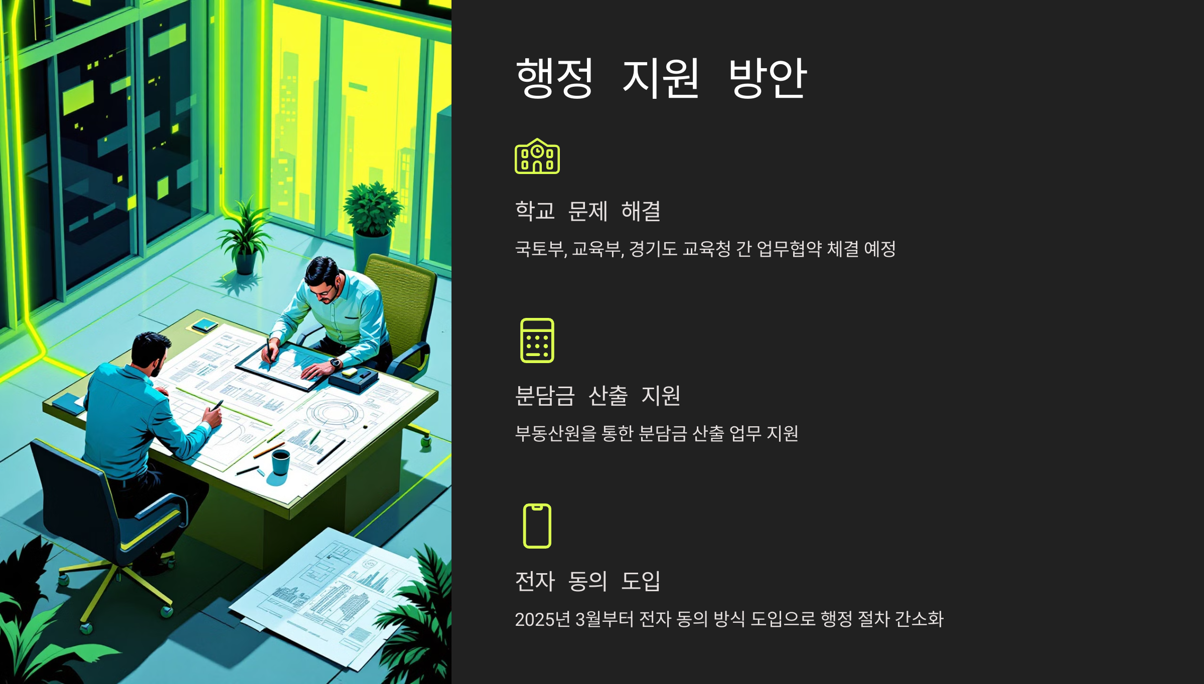 학교 문제 사전 해소: 정비 사업에서 학교 관련 문제로 인한 장기 지연을 방지하기 위해, 국토부와 교육부, 경기도 교육청 간의 업무협약을 12월에 체결하고 긴밀한 협력을 이어갈 예정입니다.