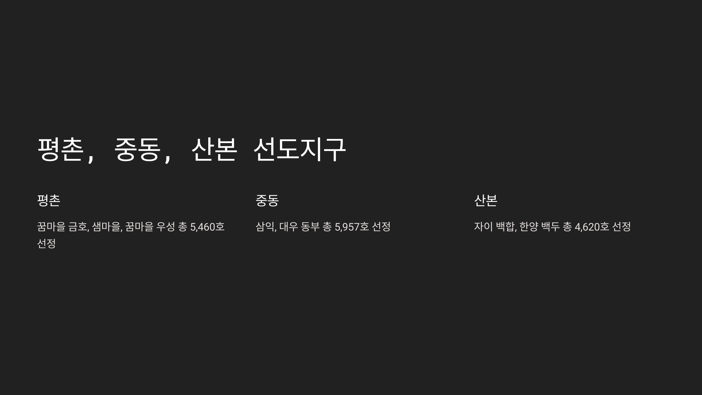 - 평촌: 꿈마을 금호 (1,750호), 샘마을 (2,334호), 꿈마을 우성 (1,376호)로 총 5,460호가 선정되었습니다.