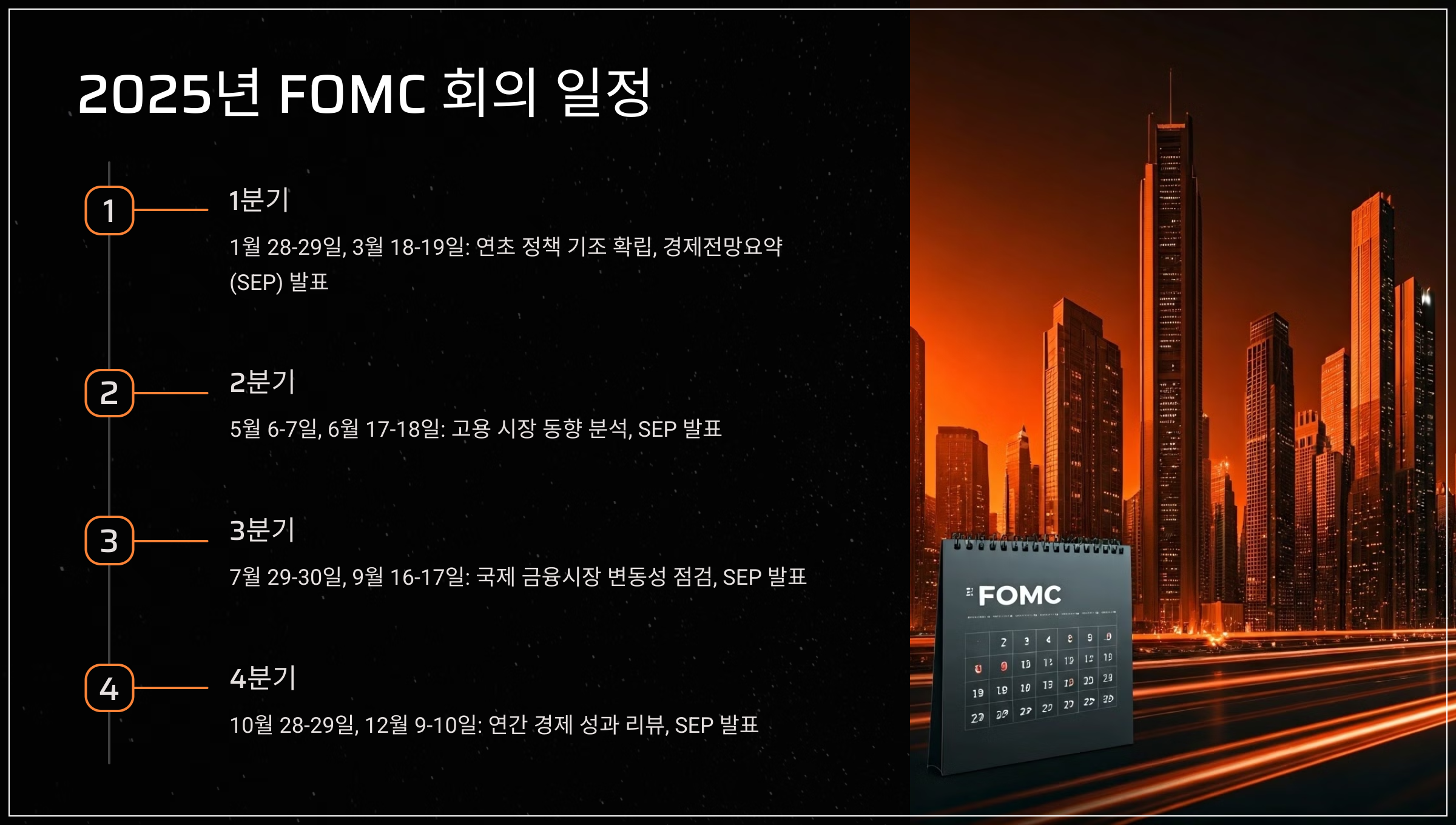 이러한 궁금증을 해소하기 위해, 2025년 FOMC 회의 일정과 금리 전망을 정리하고 투자 전략에 필요한 핵심 포인트를 살펴보겠다.