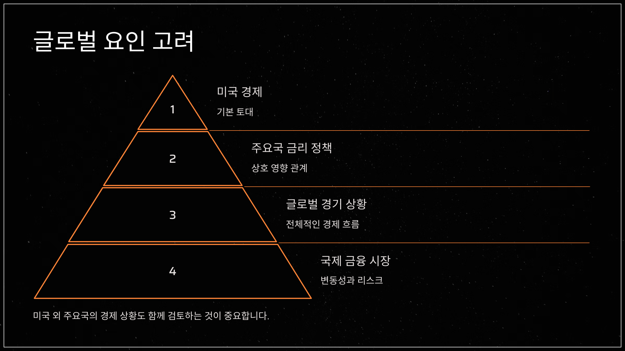 ✔️ 글로벌 요인 고려: 미국 외 주요국의 금리 정책과 경기 상황도 함께 검토하는 것이 바람직하다.