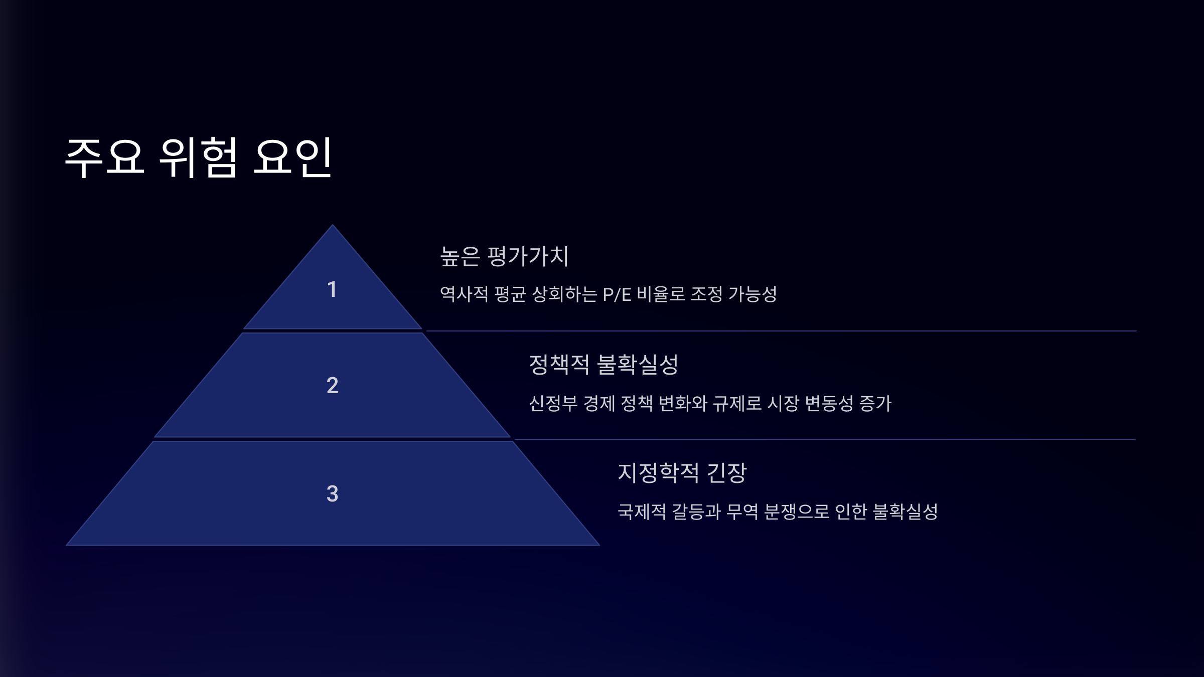 • 높은 평가가치: 현재 시장은 역사적 평균을 상회하는 높은 P/E 비율을 보여 조정 가능성이 있습니다.