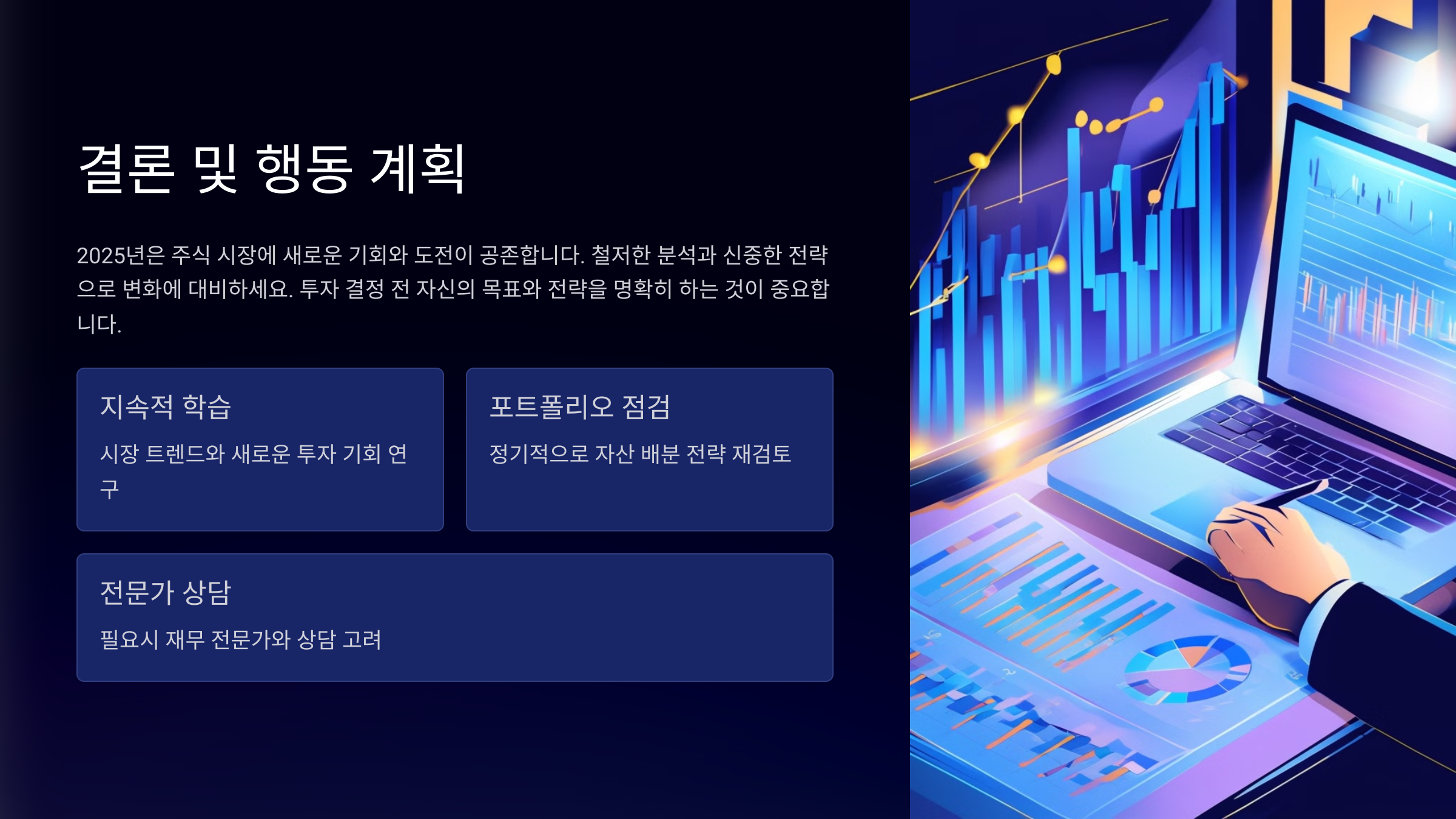 2025년은 주식 시장에서 새로운 기회와 도전이 공존하는 해가 될 것입니다. 저는 철저한 분석과 신중한 전략으로 이러한 변화를 준비하고 있으며, 성공적인 성과를 기대하고 있습니다. 투자 결정을 내리기 전에 항상 자신의 목표와 전략을 명확히 하세요. 여러분도 변동성이 큰 환경 속에서 올바른 전략으로 성공적인 투자를 이루시길 바랍니다.