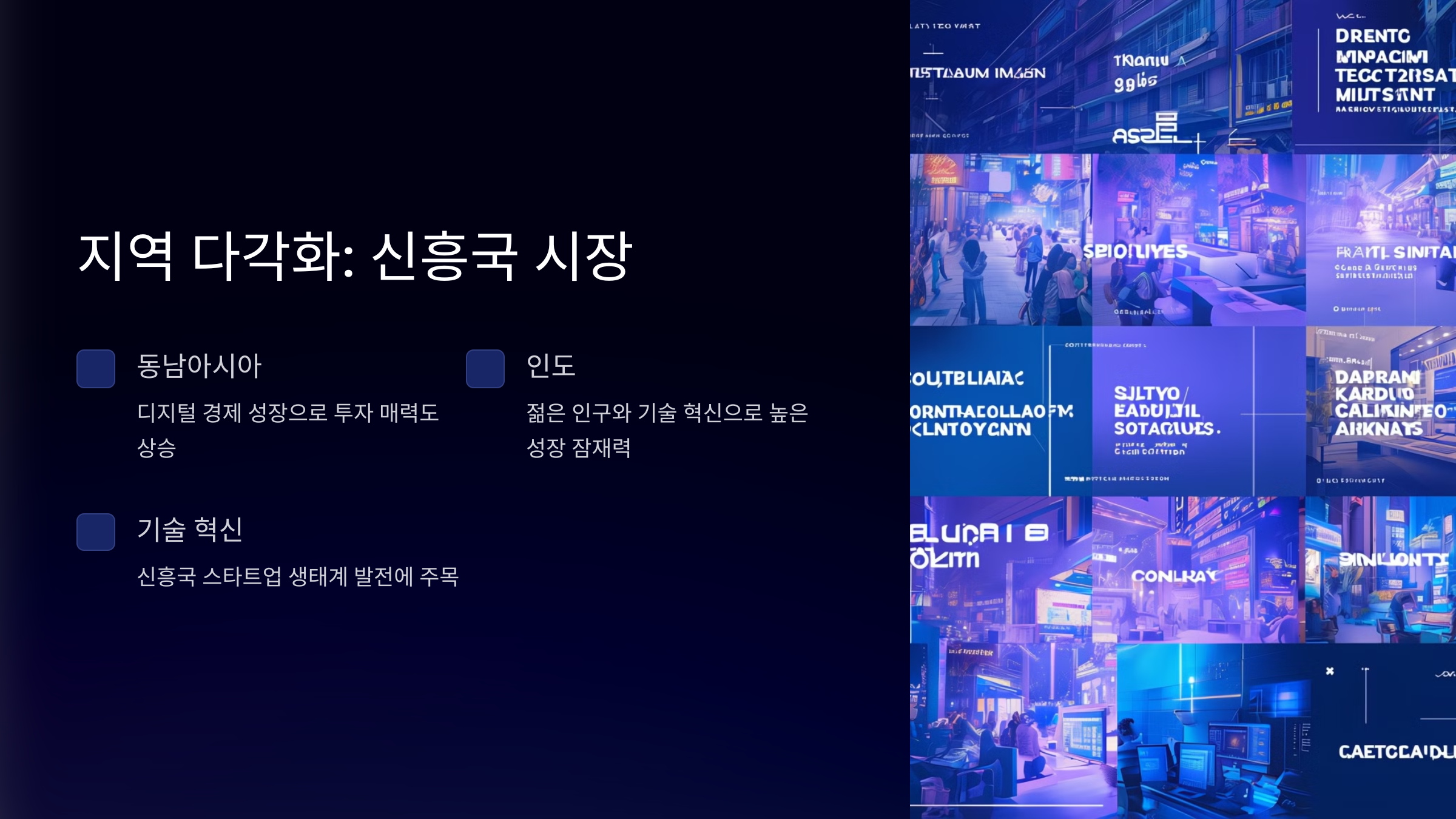 • 신흥국 시장 : 동남아시아와 인도는 기술 혁신과 소비 증가로 성장 가능성이 크다고 보고 있습니다.