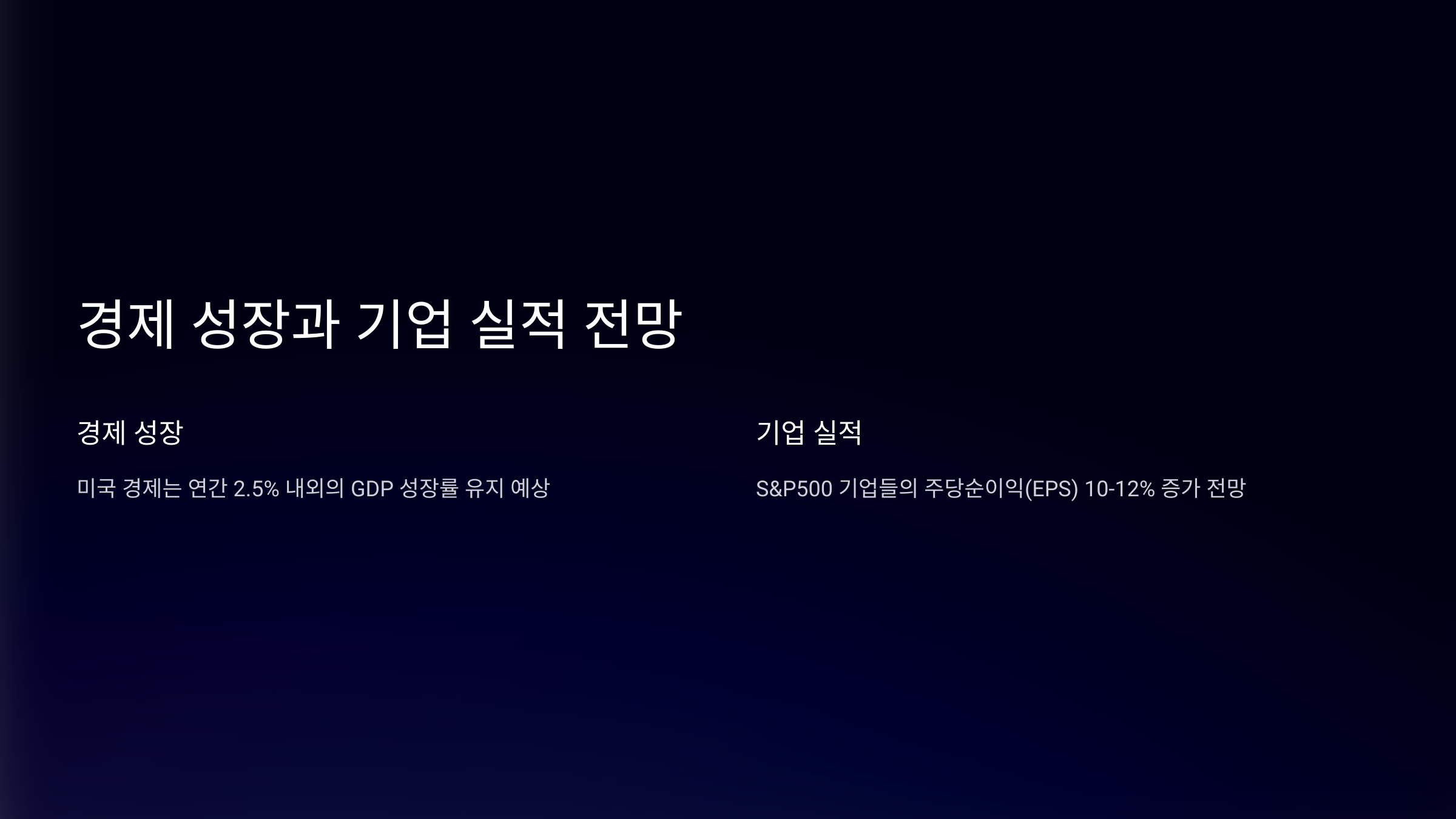 • 기업 실적: SP500 기업들의 주당순이익(EPS)은 10 ~ 12% 증가할 것으로 보이며, 이는 소비 회복과 기술 혁신 덕분입니다.