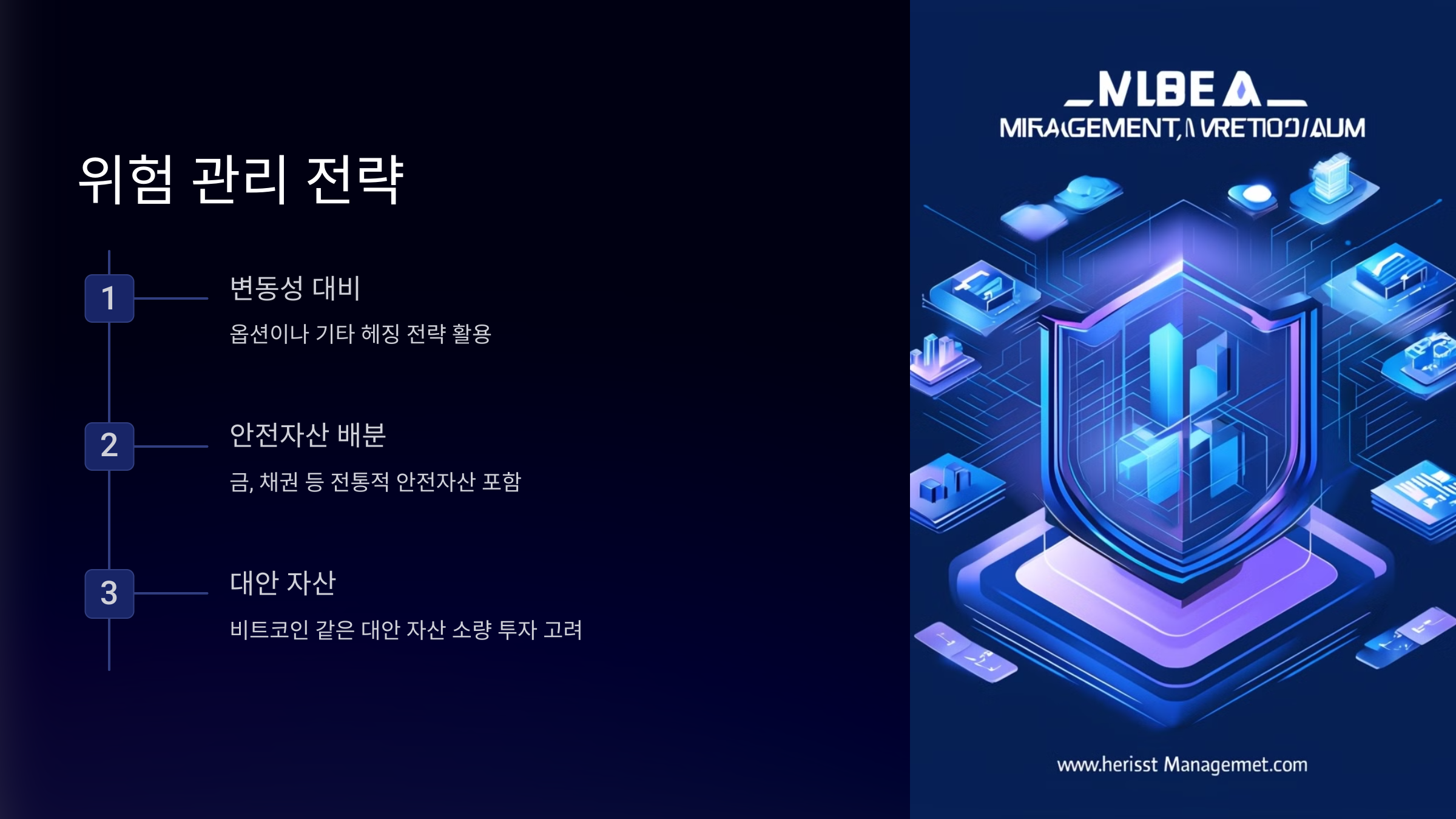 • 안전자산 배분: 금, 채권 등 전통적 안전자산과 함께 소량의 비트코인 같은 대안 자산을 포함할 계획입니다.
