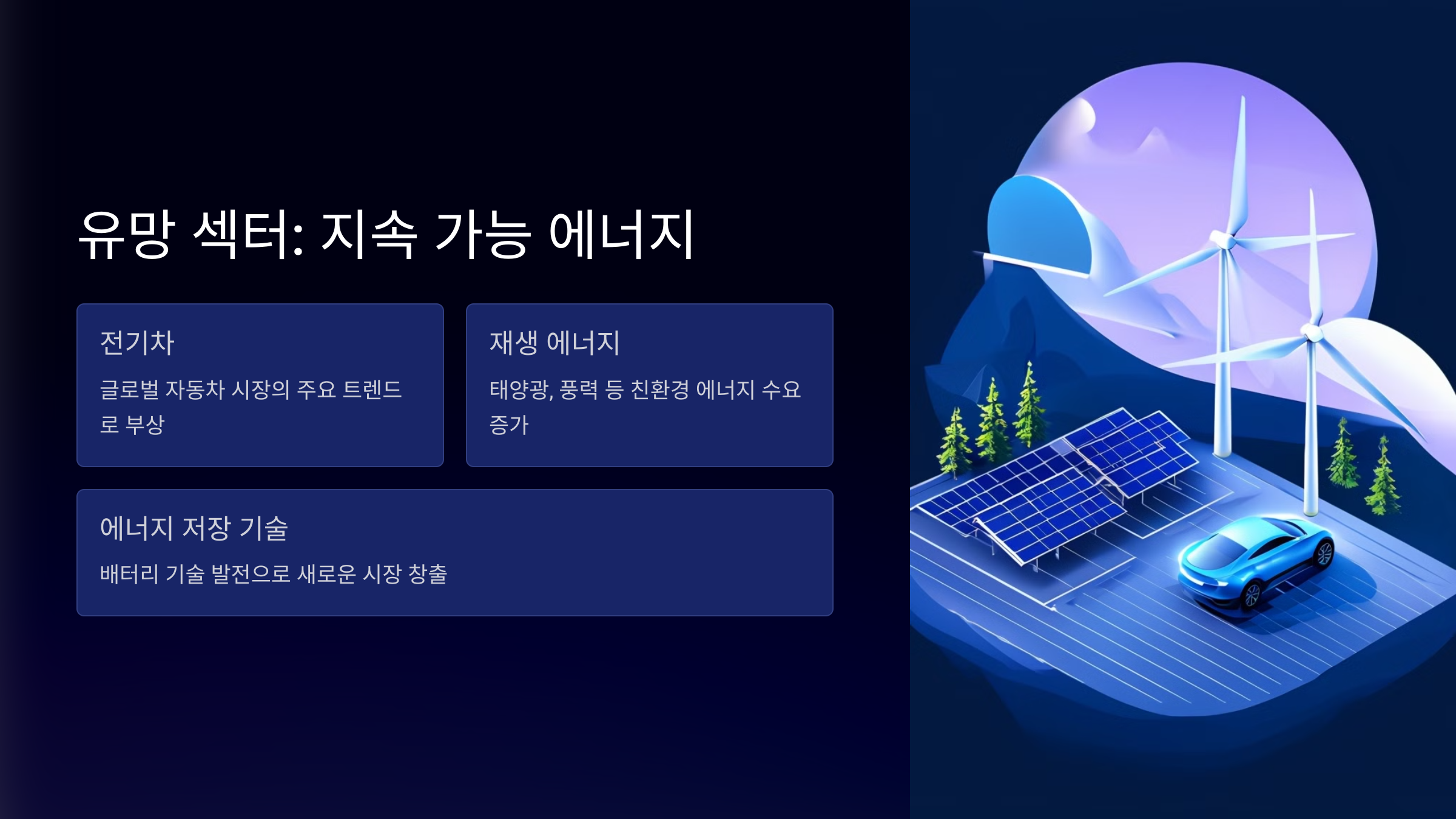• 지속 가능 에너지: 전기차와 재생 에너지 관련 기업들은 중장기적 관점에서 유망한 투자처입니다.