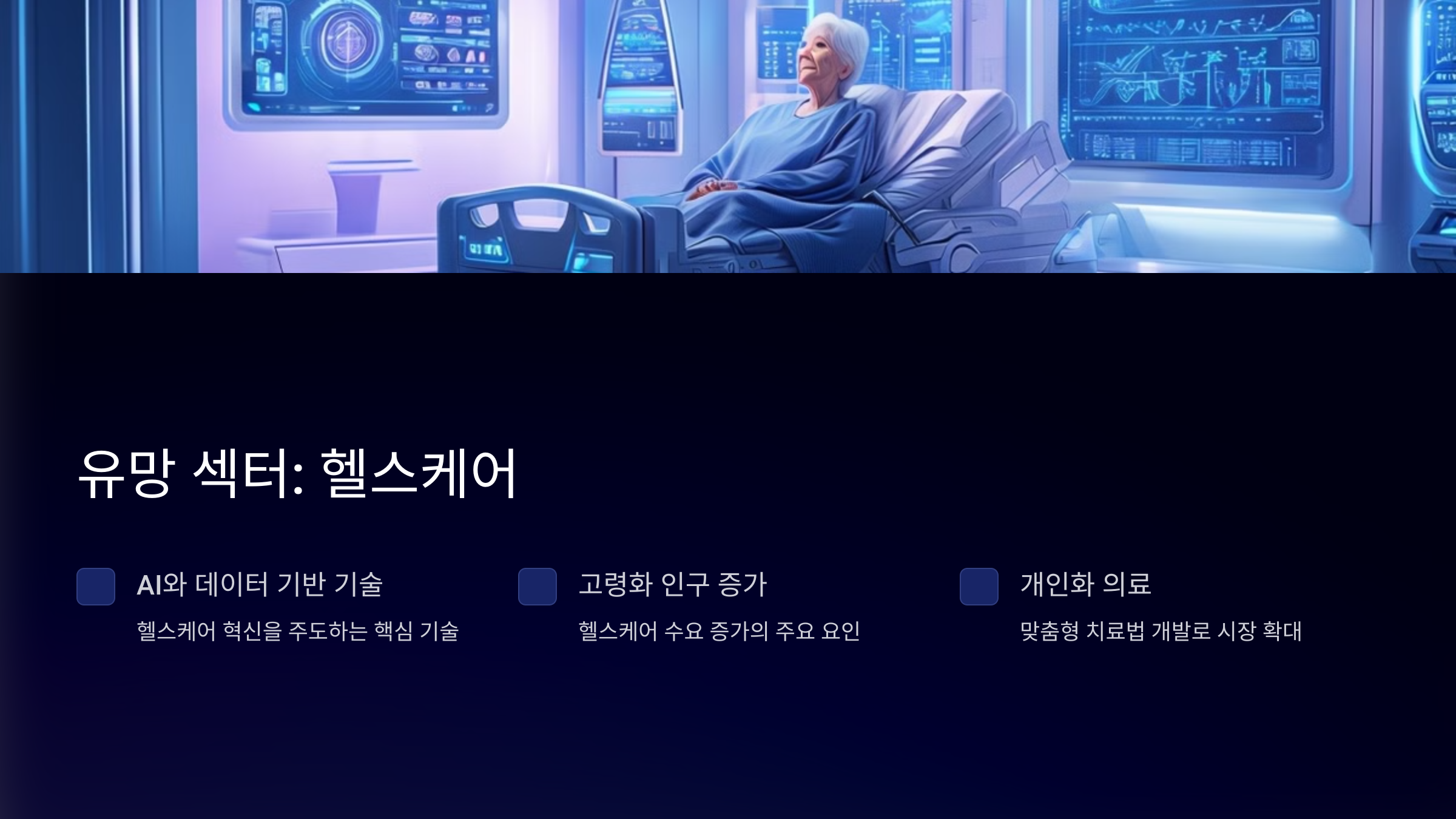 • 헬스케어: AI와 데이터 기반 기술이 헬스케어 혁신을 주도하며, 고령화 인구 증가도 긍정적인 영향을 줄 것입니다.
