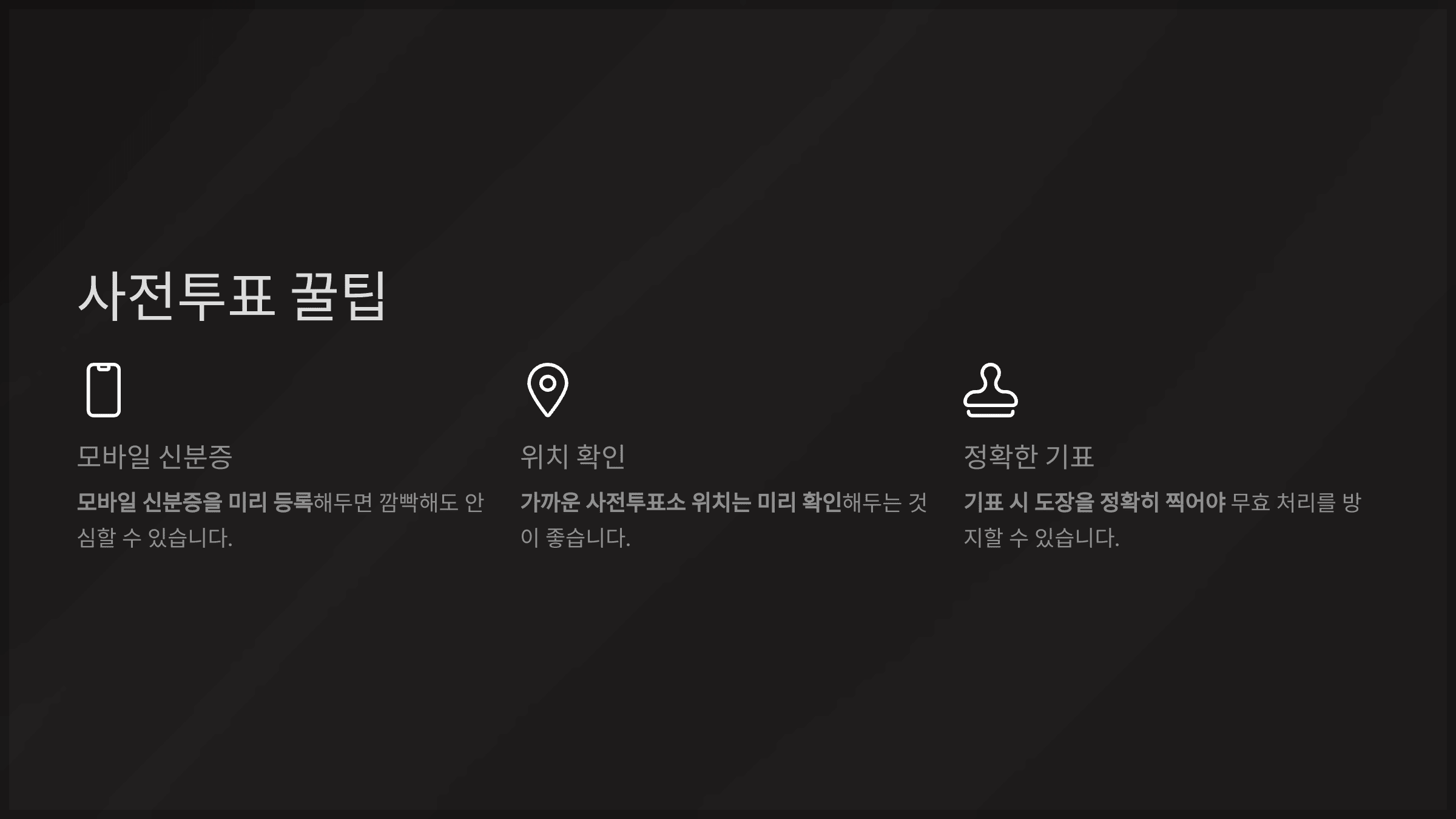 • 사전투표소와 본투표소는 다를 수 있으므로 사전 확인 필수