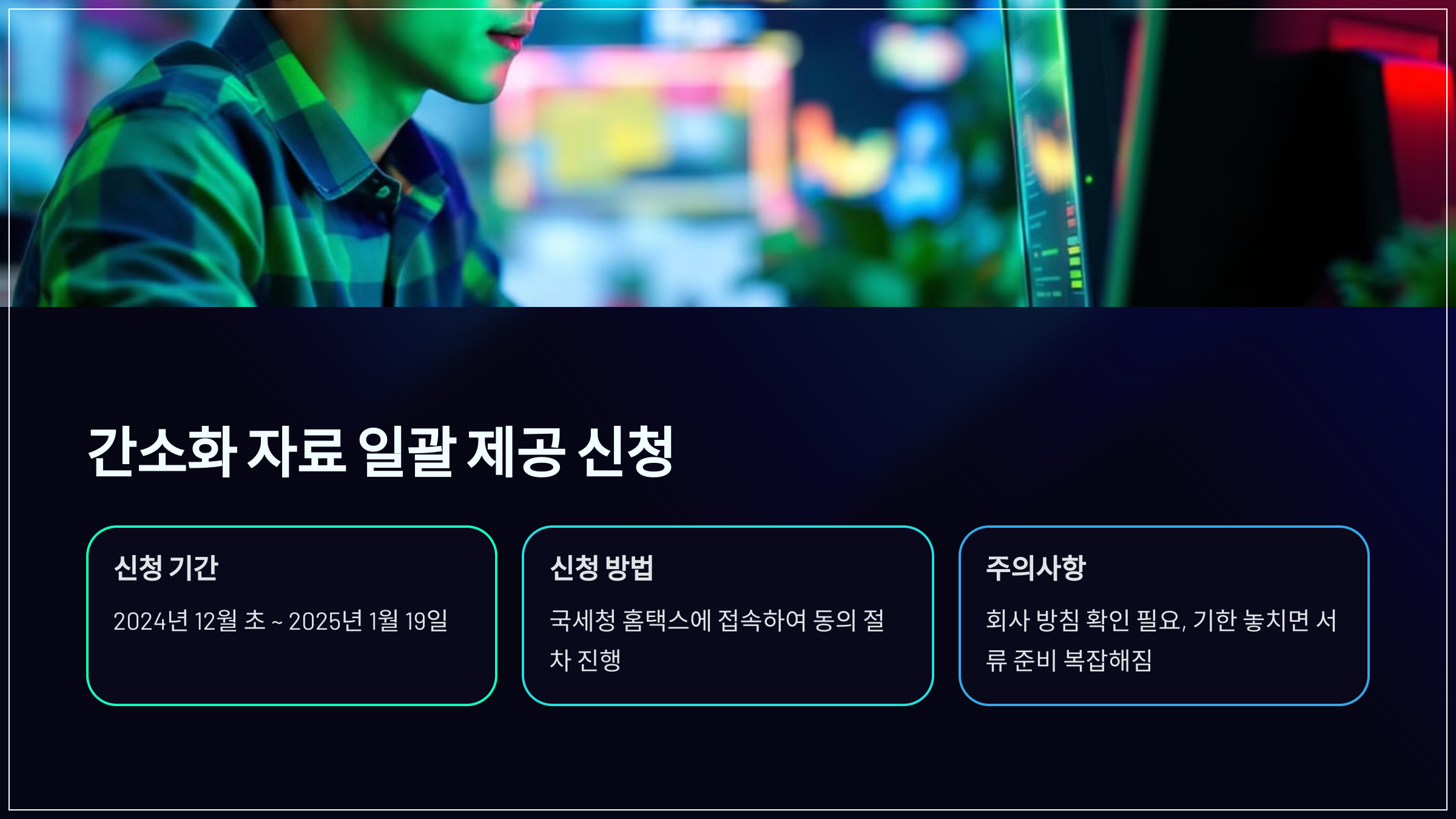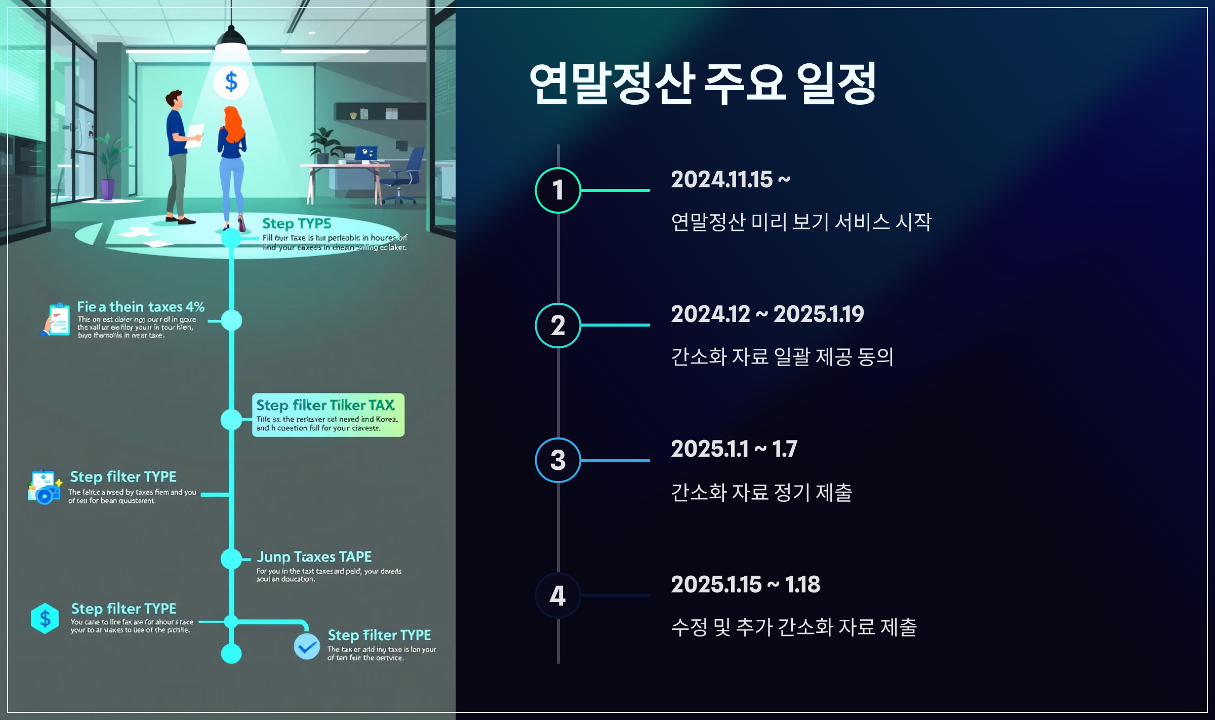 아래에서는 2025년 연말정산 일정을 시기별로 정리하고, 주요 변경사항과 유의할 점을 자세히 설명하겠습니다. 국세청 홈택스 간소화 서비스 활용법과 회사에 제출해야 할 서류도 함께 확인하시면, 번거로운 절차 없이 깔끔하게 정산을 마무리할 수 있을 것입니다.