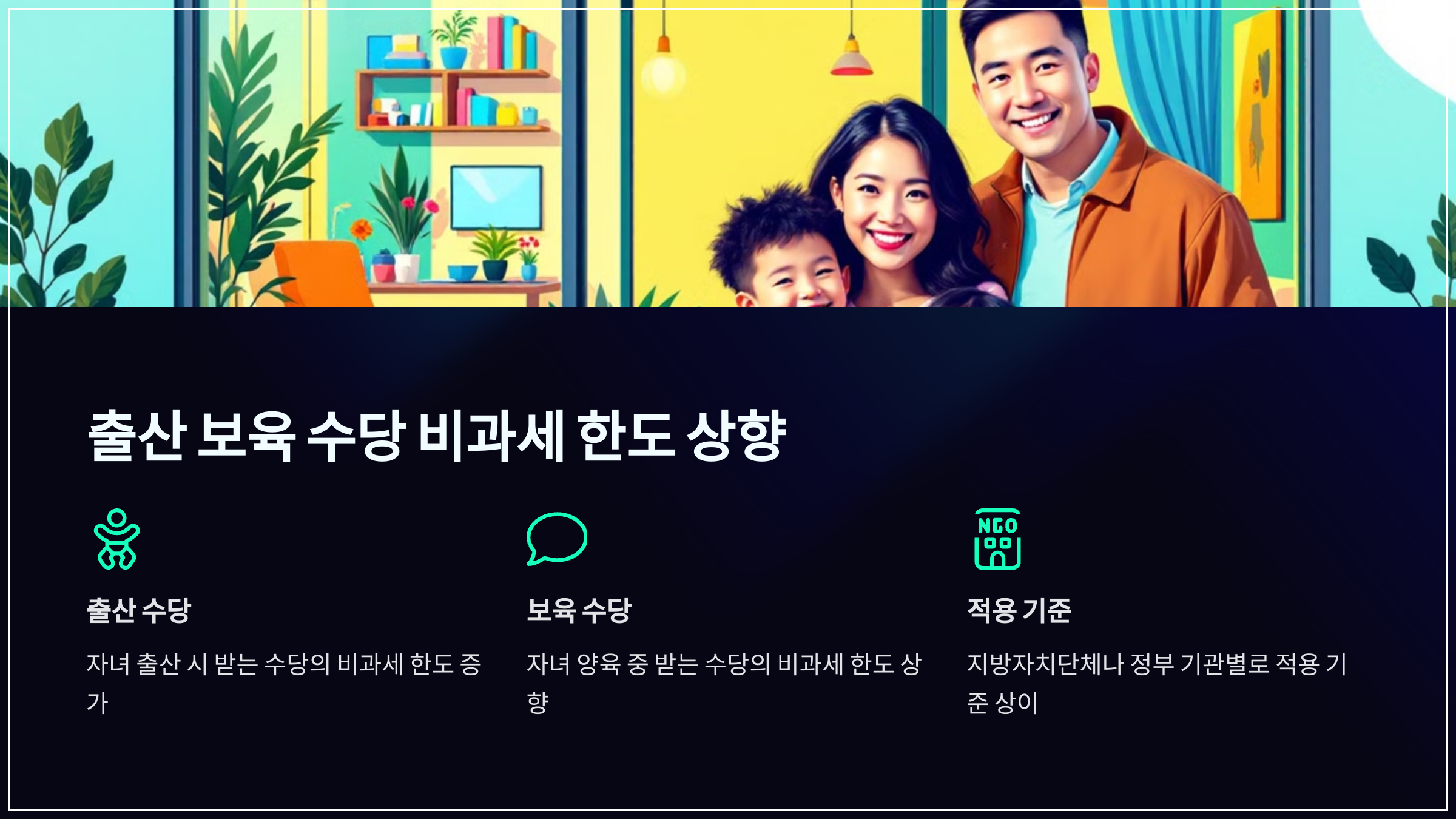 자녀를 출산하거나 양육 중이라면, 수당을 받을 때 비과세 한도가 기존보다 늘어났습니다. 지방자치단체나 정부 기관별로 적용 기준이 다를 수 있으므로, 해당 기관에서 운영 중인 출산 보육 수당 정보를 사전에 확인하세요.