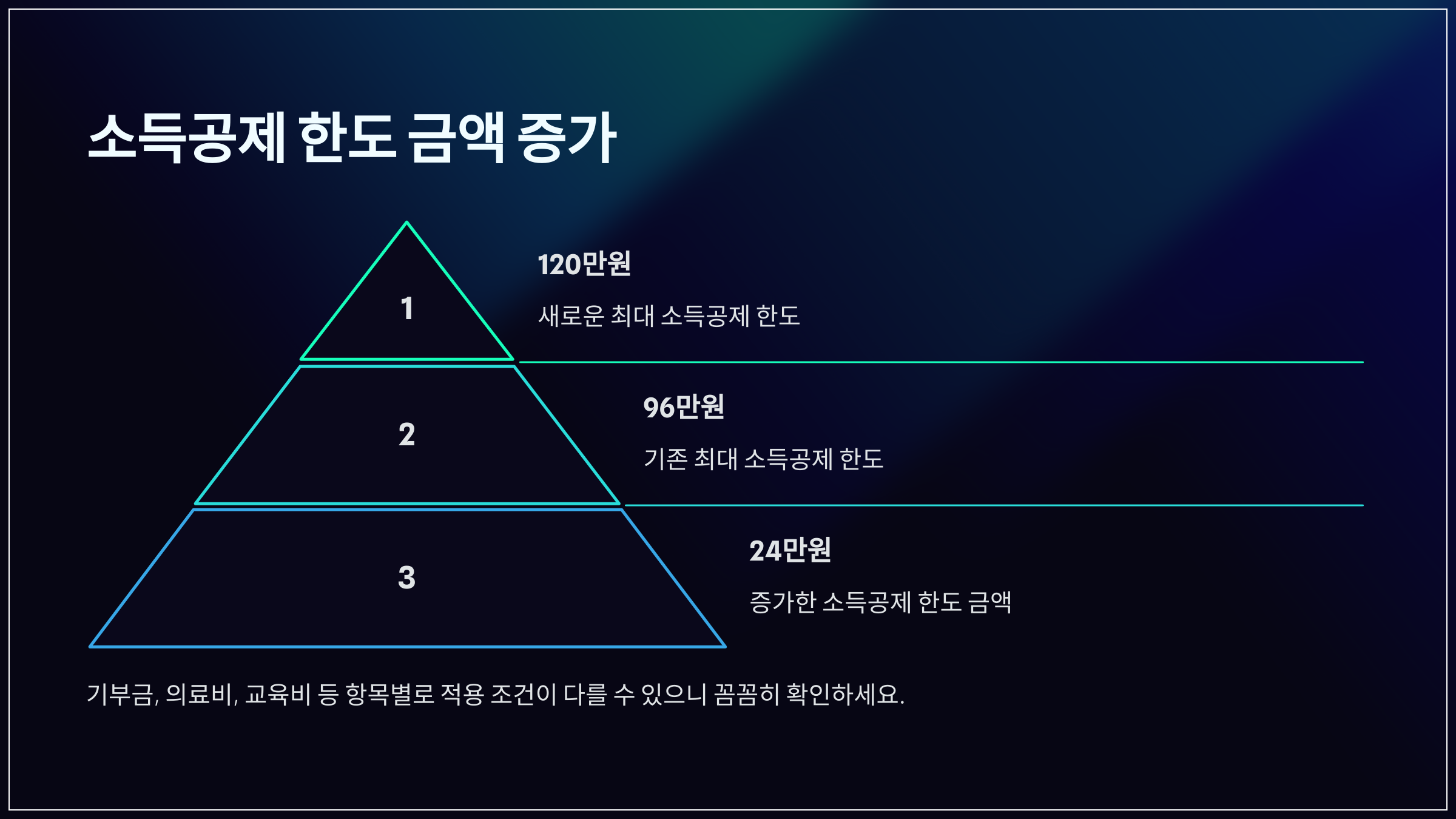 기존에 최대 96만 원까지 적용되던 소득공제 한도가 최대 120만 원으로 확대되었습니다. 해당 공제 항목마다 적용 조건이 다를 수 있으니, 기부금, 의료비, 교육비 같은 항목에 관해 확인하고 본인에게 해당하는 항목을 꼼꼼히 챙기세요.