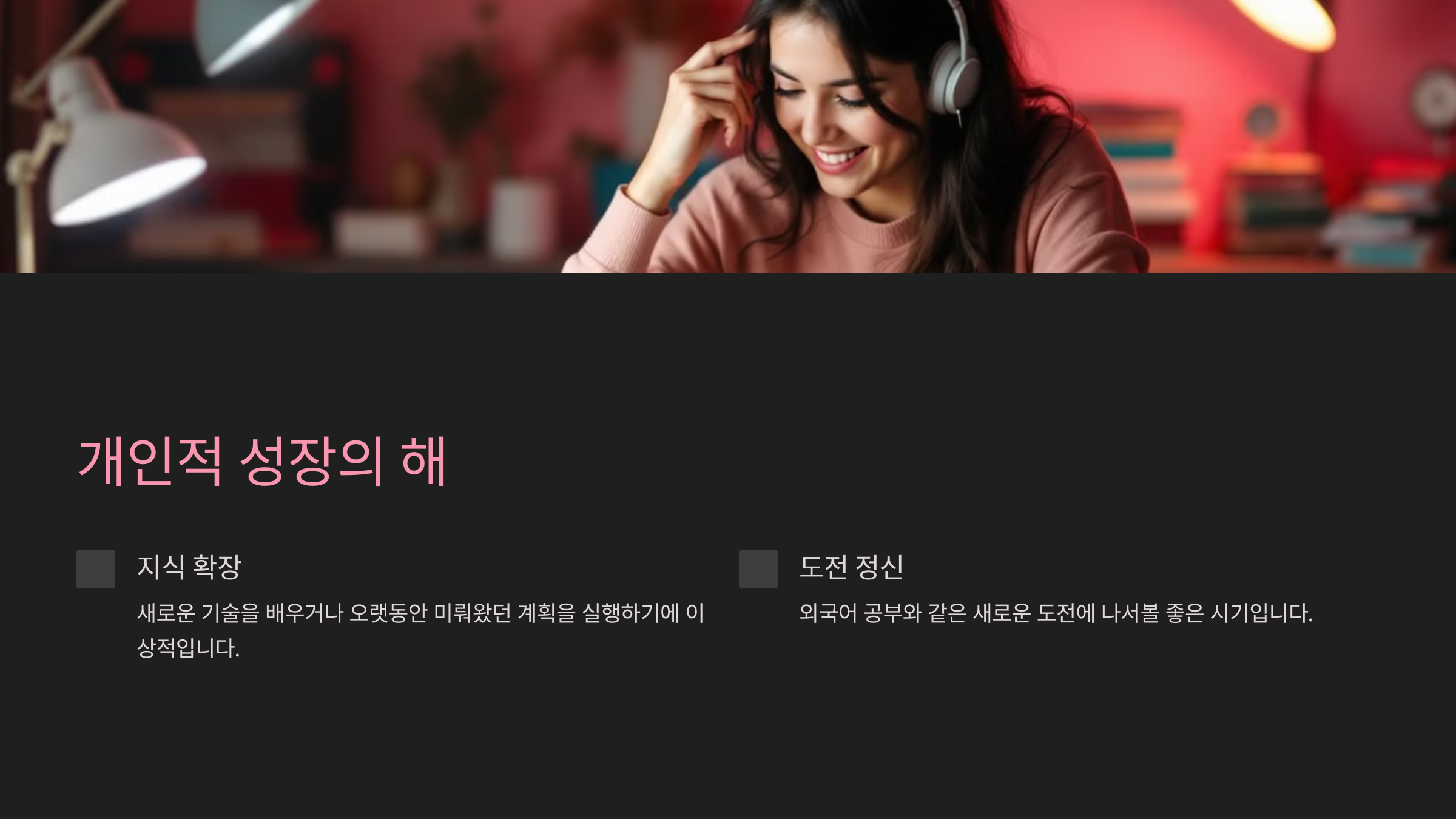 이러한 상징은 지식과 경험의 확장을 통해 개인적 성장을 이룰 수 있는 해임을 암시합니다. 새로운 기술을 배우거나 오랫동안 미뤄왔던 계획을 실행하기에 이상적입니다. 개인적으로는 올해를 계기로 외국어 공부와 같은 새로운 도전에 나서볼 생각입니다. 여러분도 미뤄왔던 목표를 떠올리며 을사년을 뜻깊게 만들어보세요.