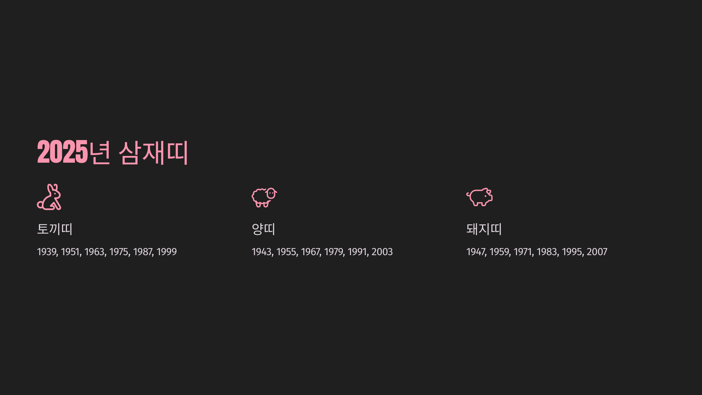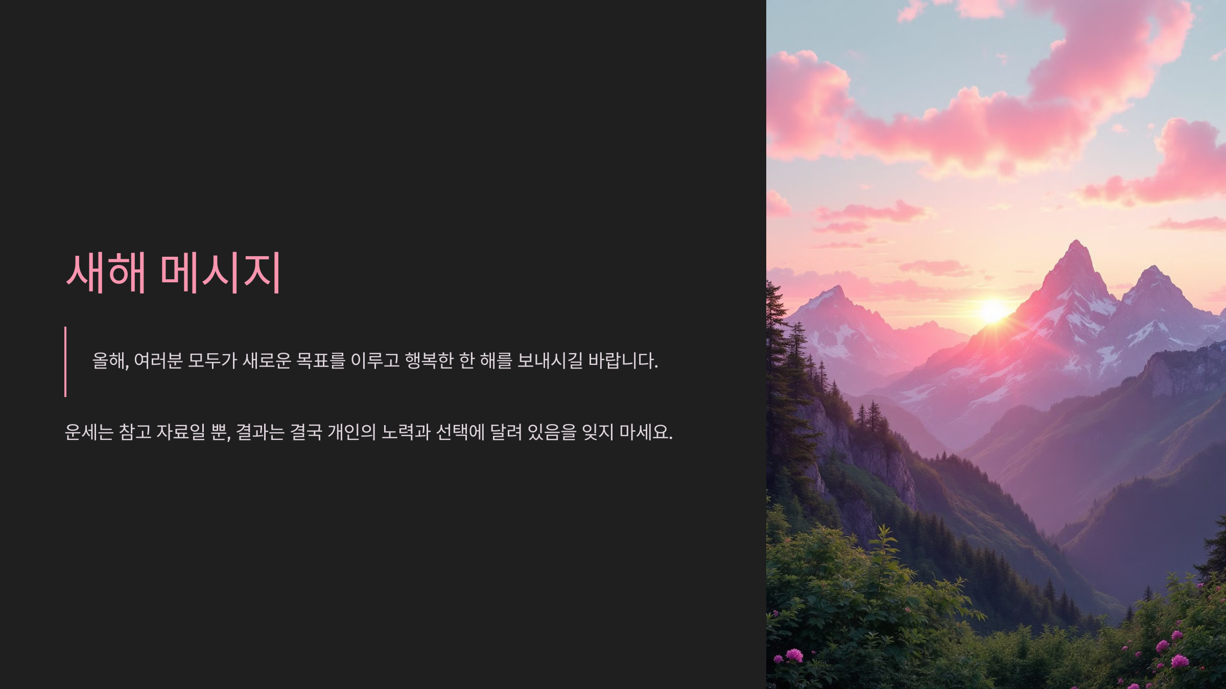 2025년은 변화와 도전이 공존하는 해입니다. 삼재 띠에 해당하신다면 신중함과 준비를, 대박띠라면 적극적인 자세로 한 해를 맞이하세요. 무엇보다도 결과는 노력과 선택에 따라 달라지며, 운세는 참고 자료일 뿐임을 기억하세요.