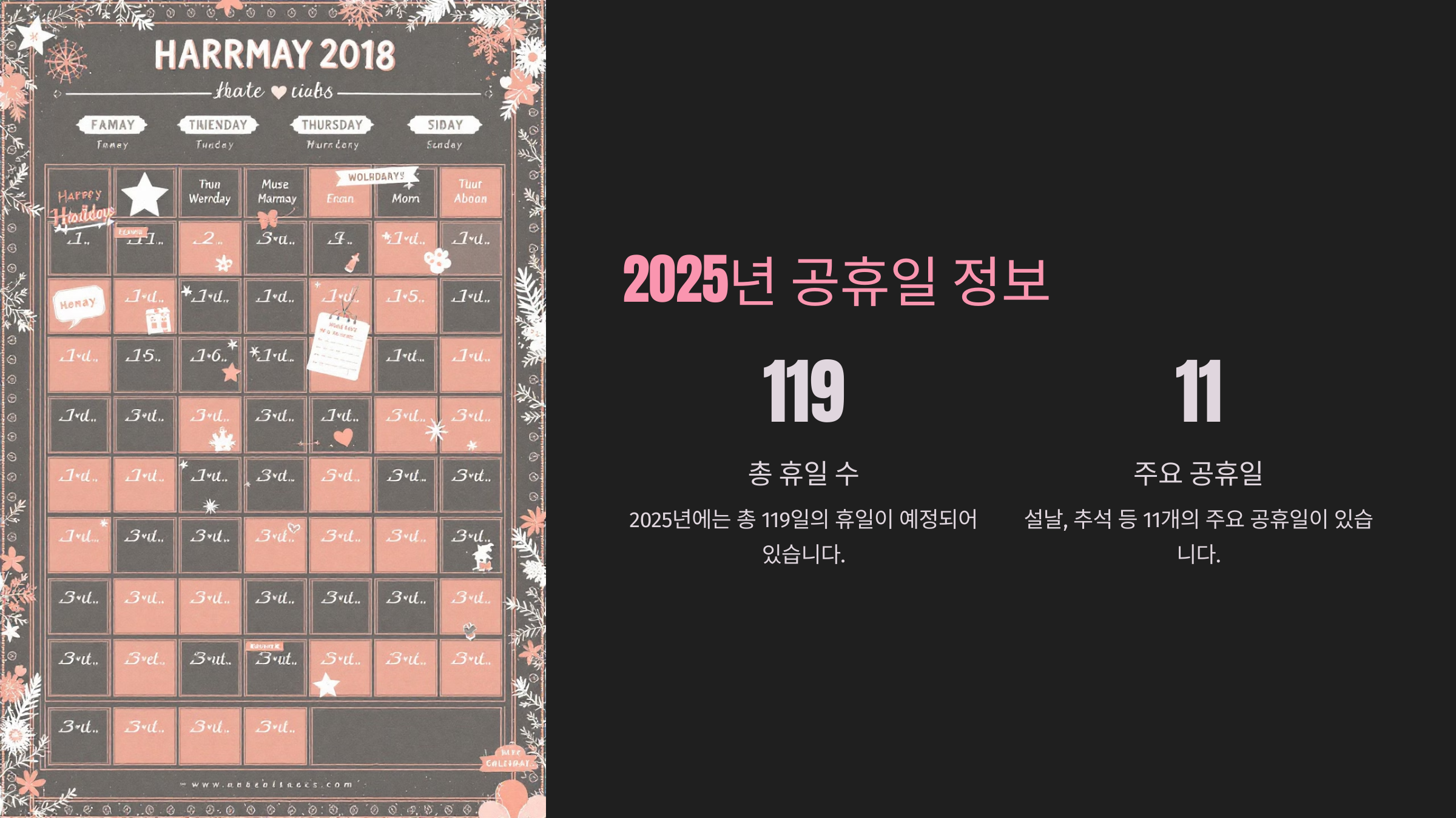 2025년에는 총 119일의 휴일이 예정되어 있습니다. 설날과 추석 대체공휴일 덕분에 긴 연휴를 활용할 수 있어 여행이나 가족과의 시간을 계획하기 좋은 해입니다.