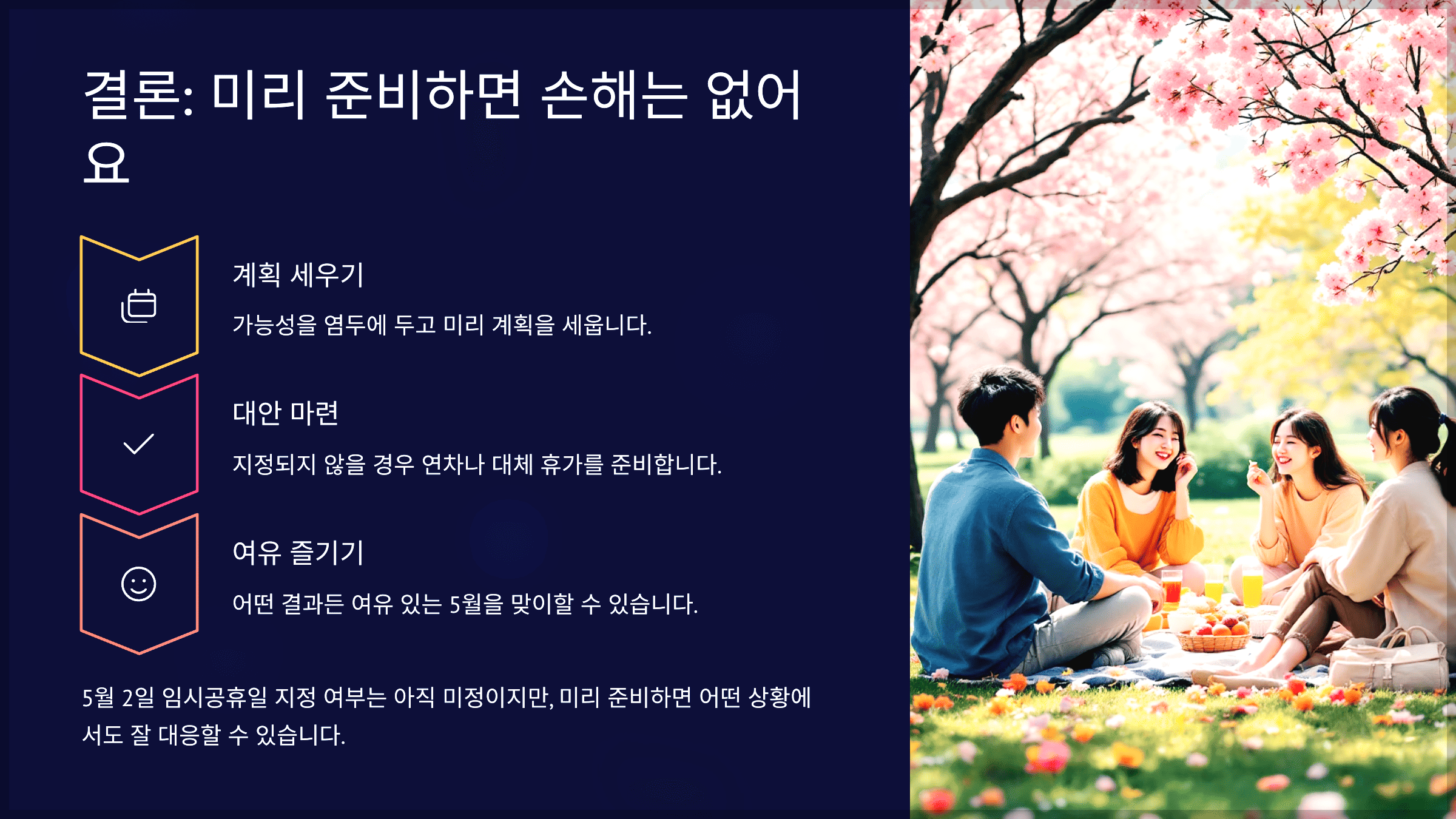 5월 2일이 임시공휴일로 지정될지 여부는 아직 결정되지 않았지만, 가능성을 염두에 두고 움직인다면 어떤 결과든 잘 대응할 수 있어요.