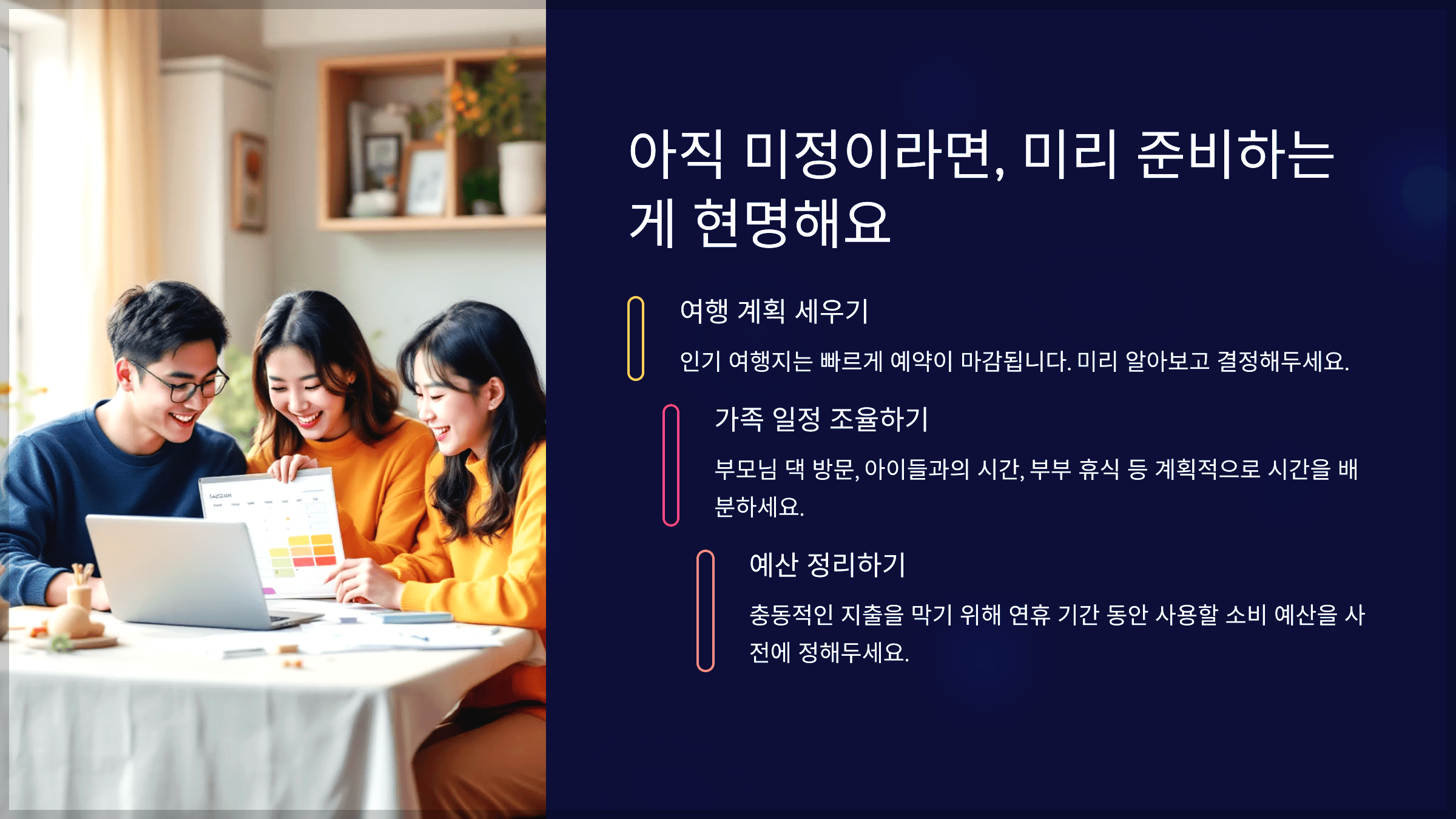 인기 여행지는 빠르게 예약이 마감되기 때문에, 미리 알아보고 결정해 두는 것이 좋아요. - 가족 일정 조율하기