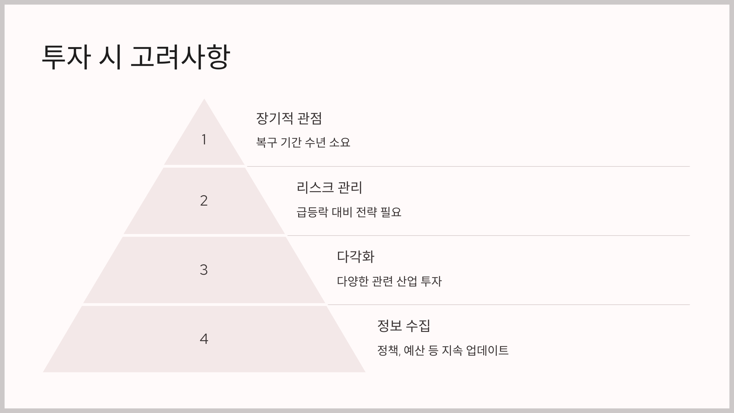 - 다각화: 특정 종목에 집중 투자하기보다는, 건설, 건축 자재, 설비, 보험 등 재난 복구와 연계된 다양한 산업에 나누어 투자하는 방안을 고려해 볼 만합니다.