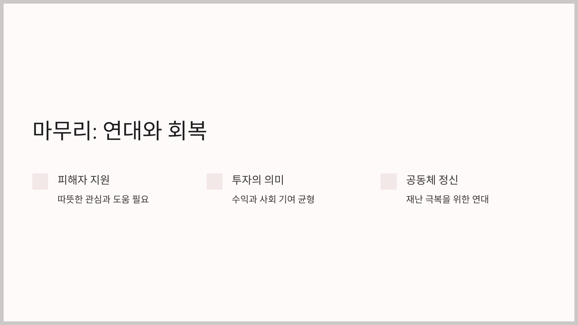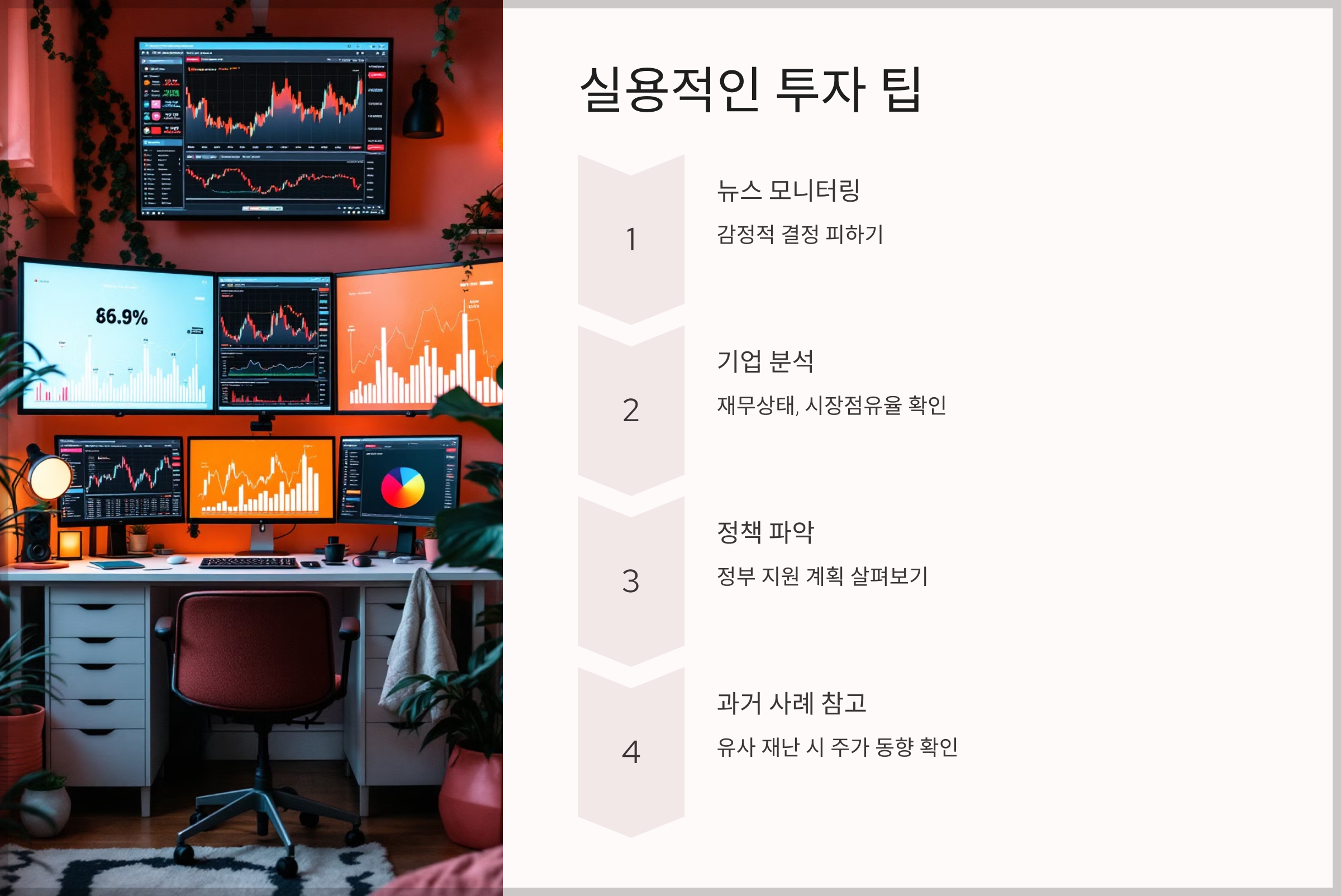 - 재난 관련 뉴스를 꾸준히 모니터링하되, 감정적인 투자 결정을 피합니다.