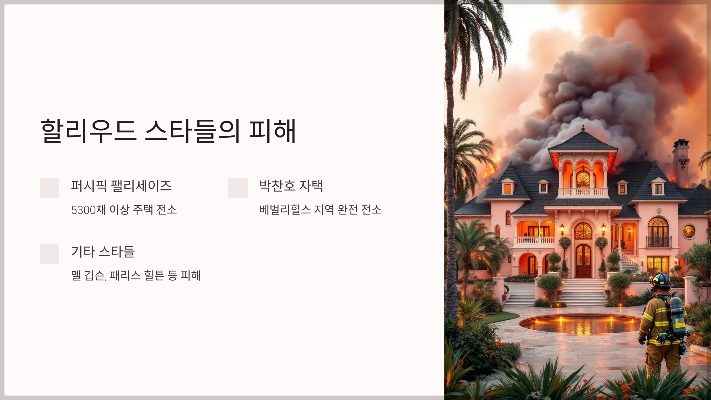 특히 할리우드 스타들이 거주하는 퍼시픽 팰리세이즈 지역에서는 5300채 이상의 주택이 전소되었다고 알려졌습니다. 이 중에서도 코리안 특급 박찬호의 자택이 전소되었다는 소식은 국내외 팬들에게 큰 안타까움을 안겼습니다.