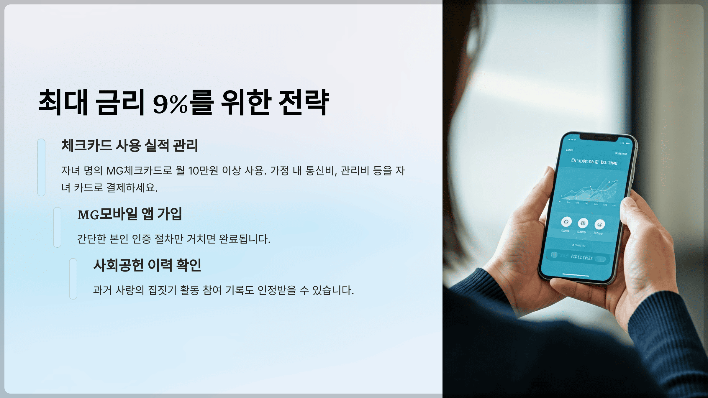 자녀 명의로 발급된 MG체크카드로 월 10만 원 이상 사용해야 하며, 가정 내 통신비, 관리비 등을 자녀 카드로 결제하여 쉽게 실적을 채울 수 있었습니다.