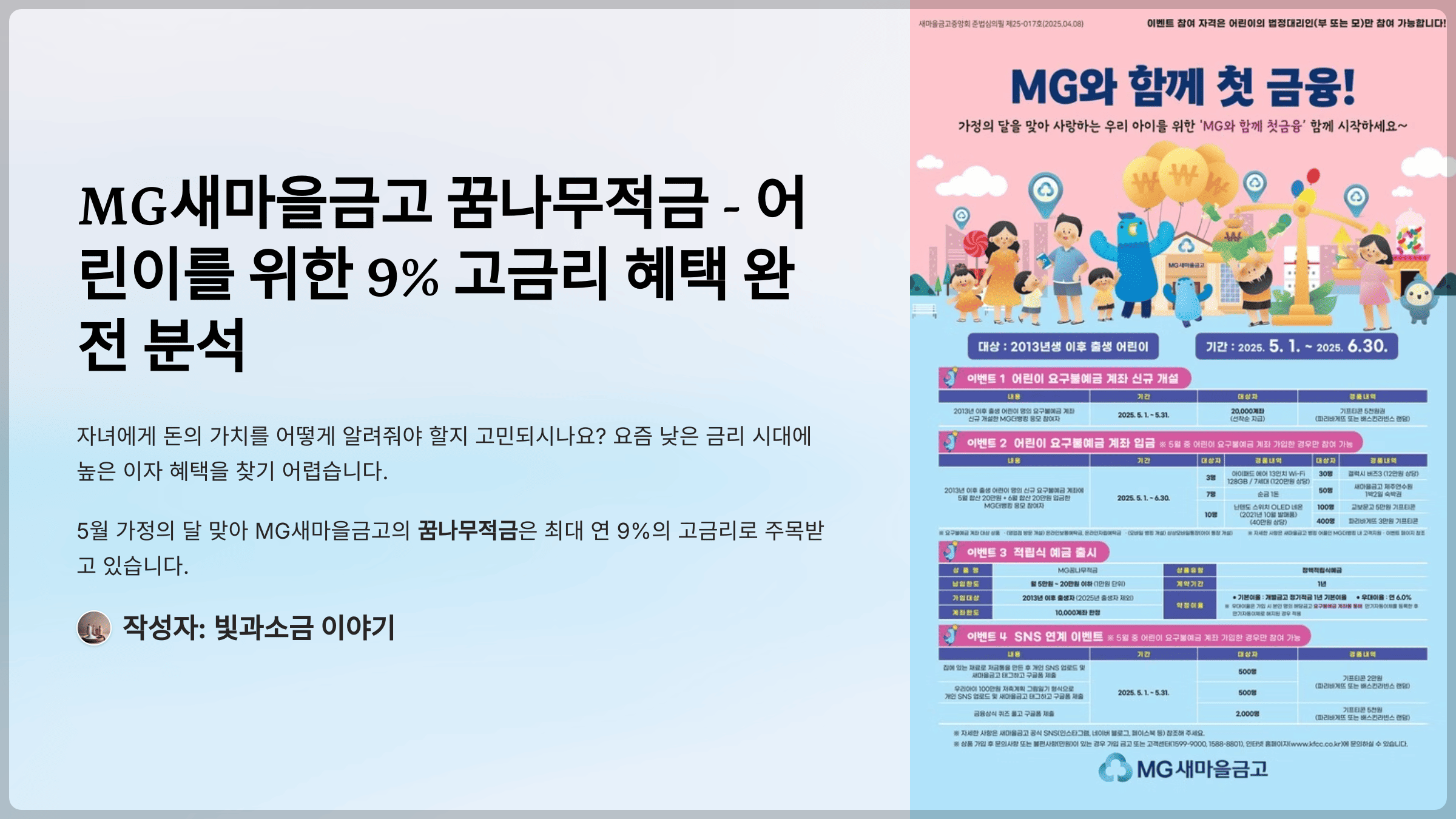 이런 가운데, 5월 가정의 달을 맞아 MG새마을금고에서 출시한 '꿈나무적금'은 최대 연 9%의 고금리를 제공하여 주목받고 있습니다.