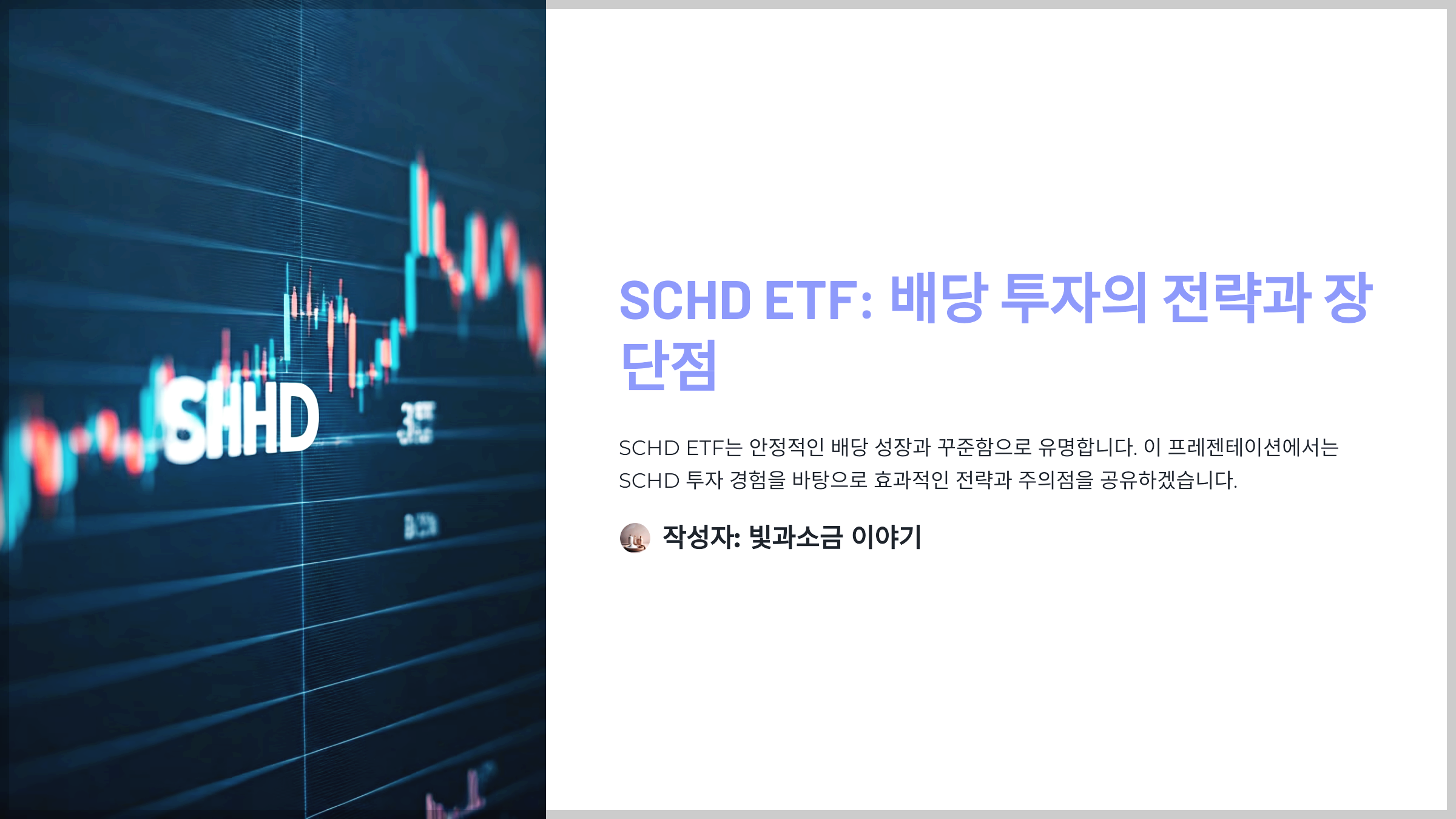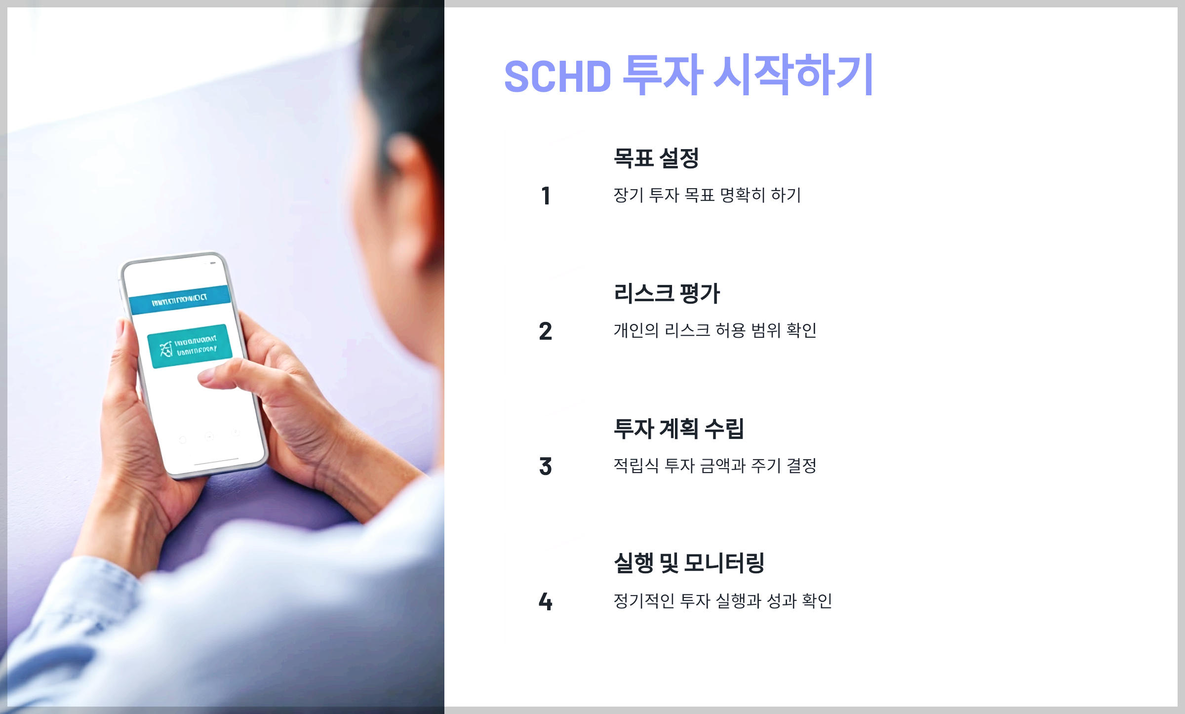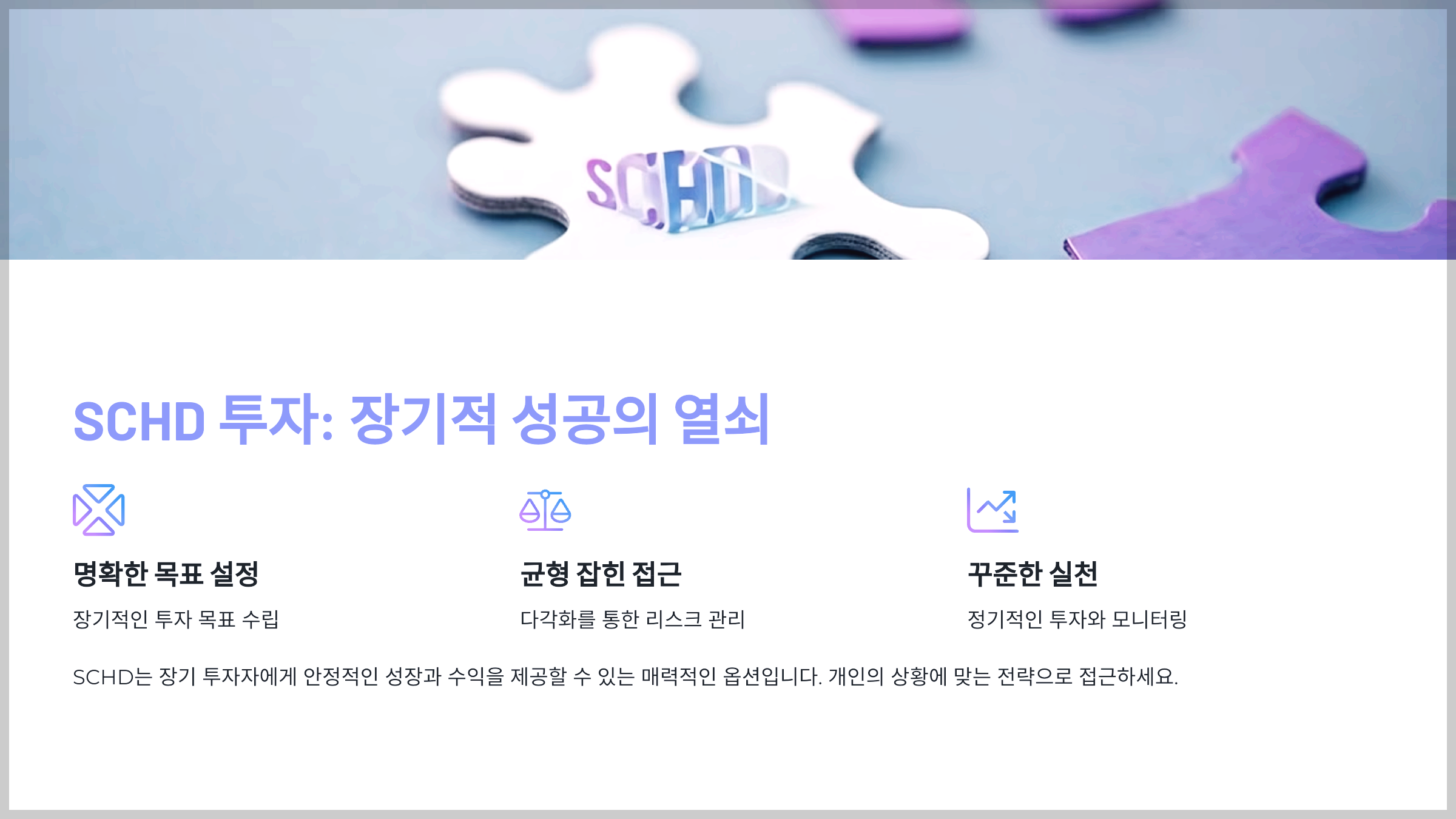 투자는 개인의 목표와 재정 상황에 따라 다르게 접근해야 합니다. SCHD가 본인의 투자 목표와 리스크 허용 범위에 맞는지 확인한 후 시작하세요. 필요하다면 금융 전문가의 조언을 받는 것도 좋은 방법입니다. 장기적으로 SCHD 투자의 매력을 체감할 수 있을 것입니다.